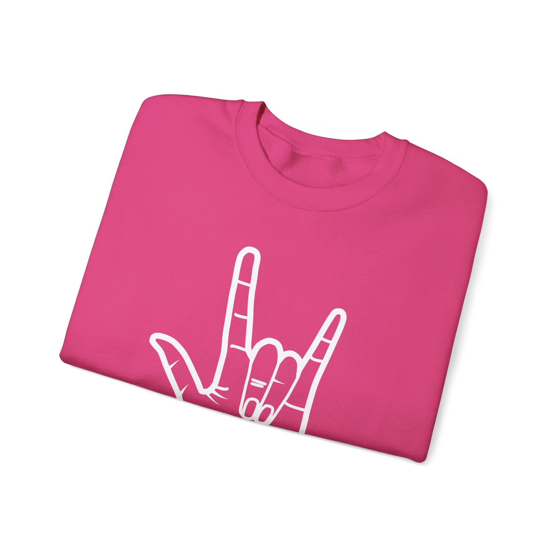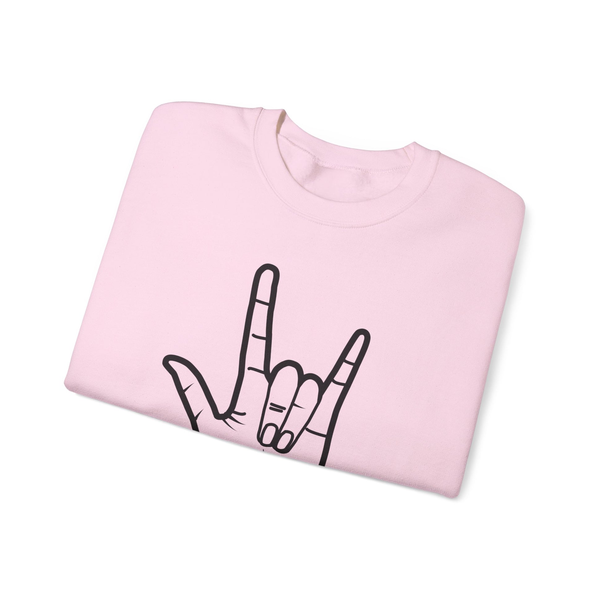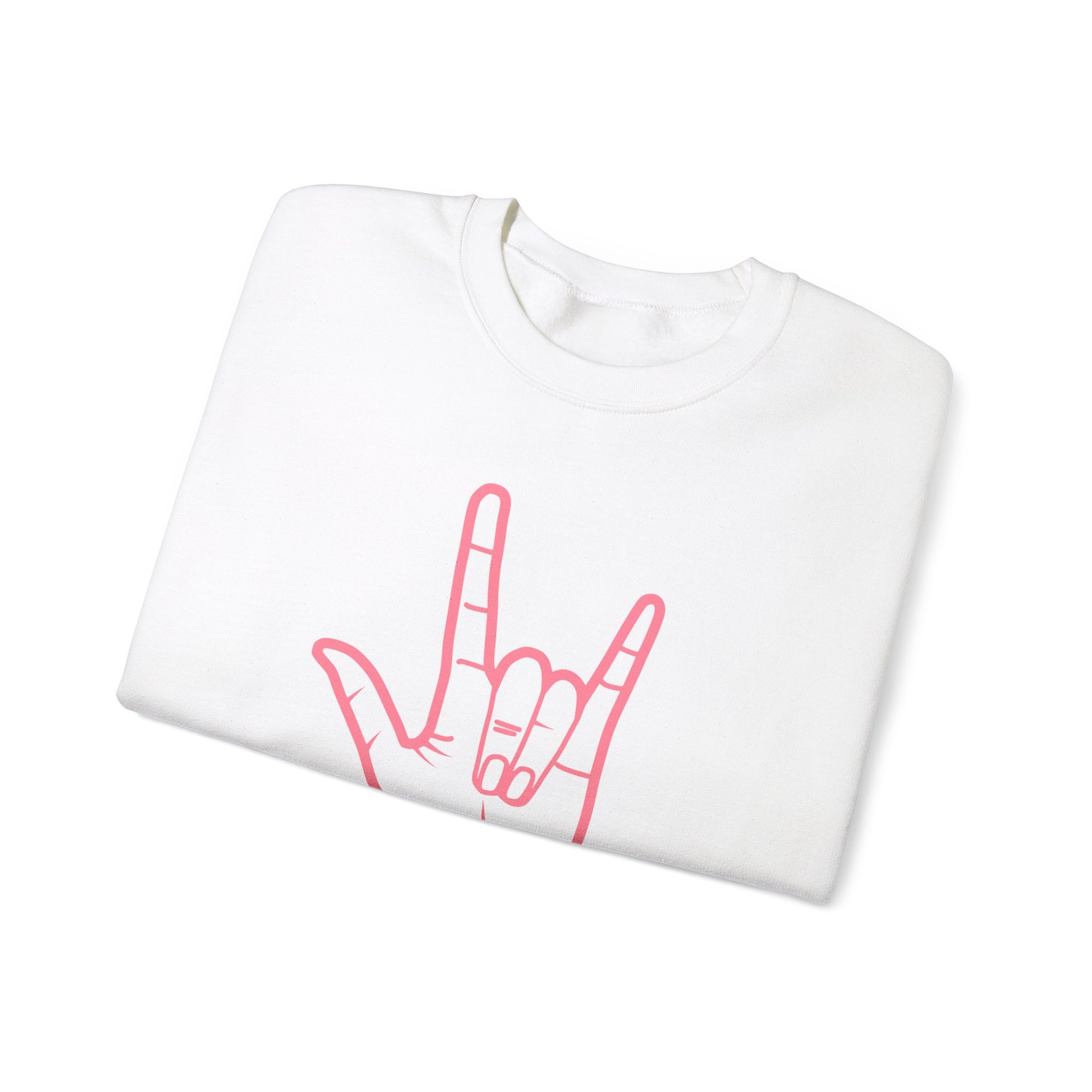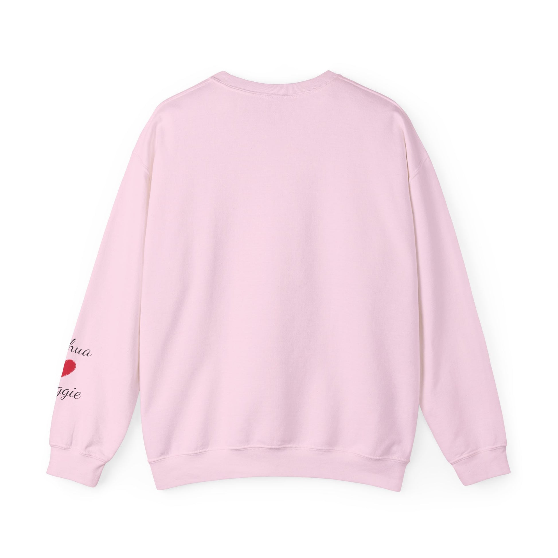 This adorable and thoughtful I Love You ASL sign unisex sweatshirt (Gildan 18000) customized with your names on a sleeve print would make her eyes light up on Valentine's Day.