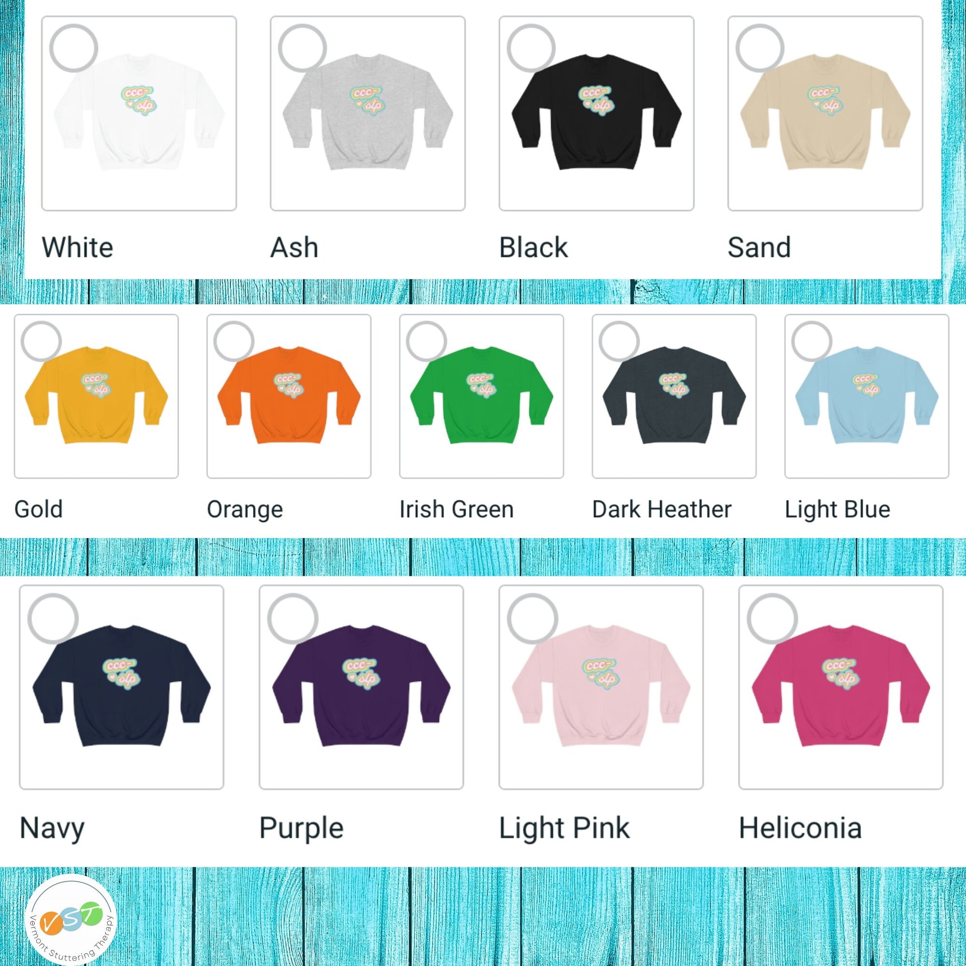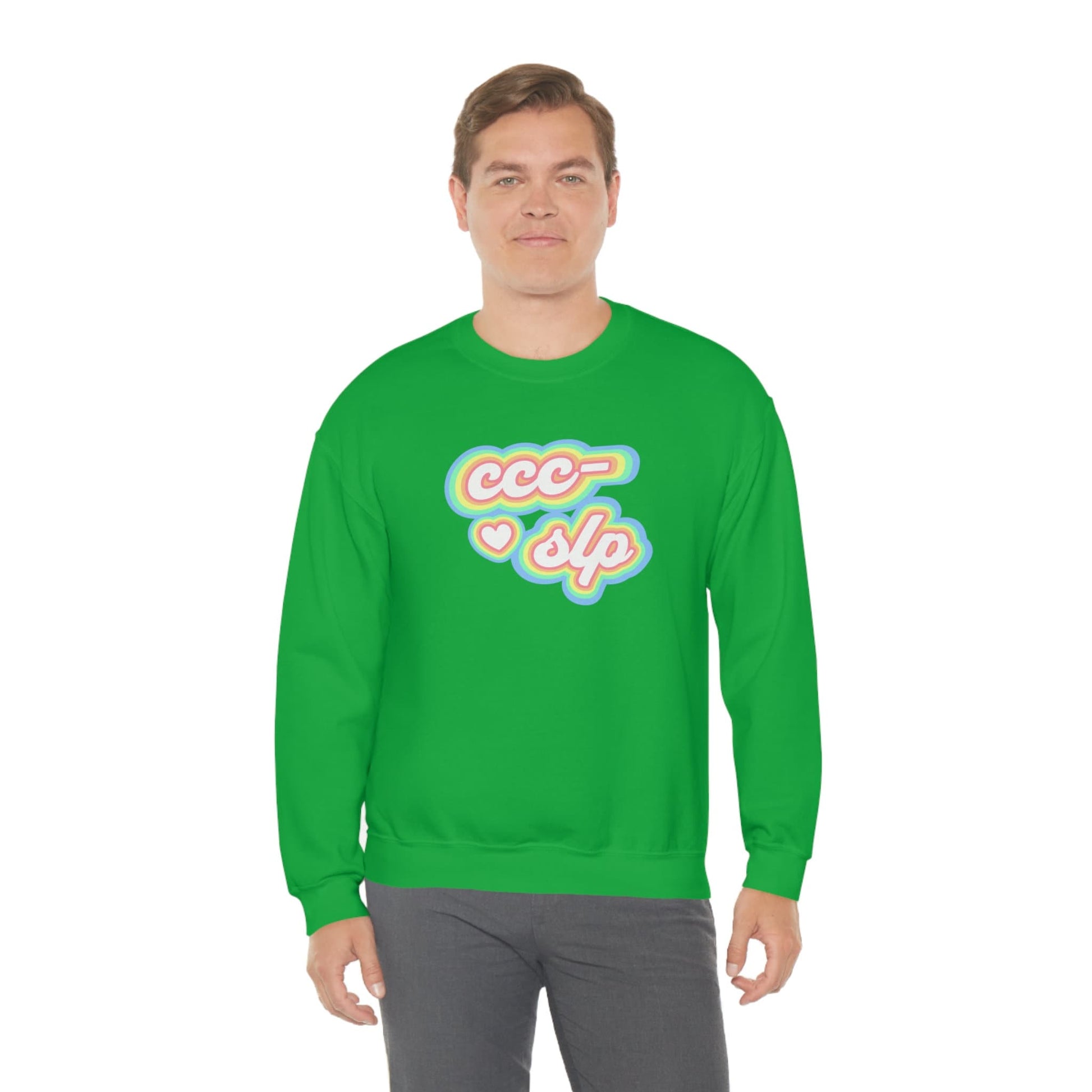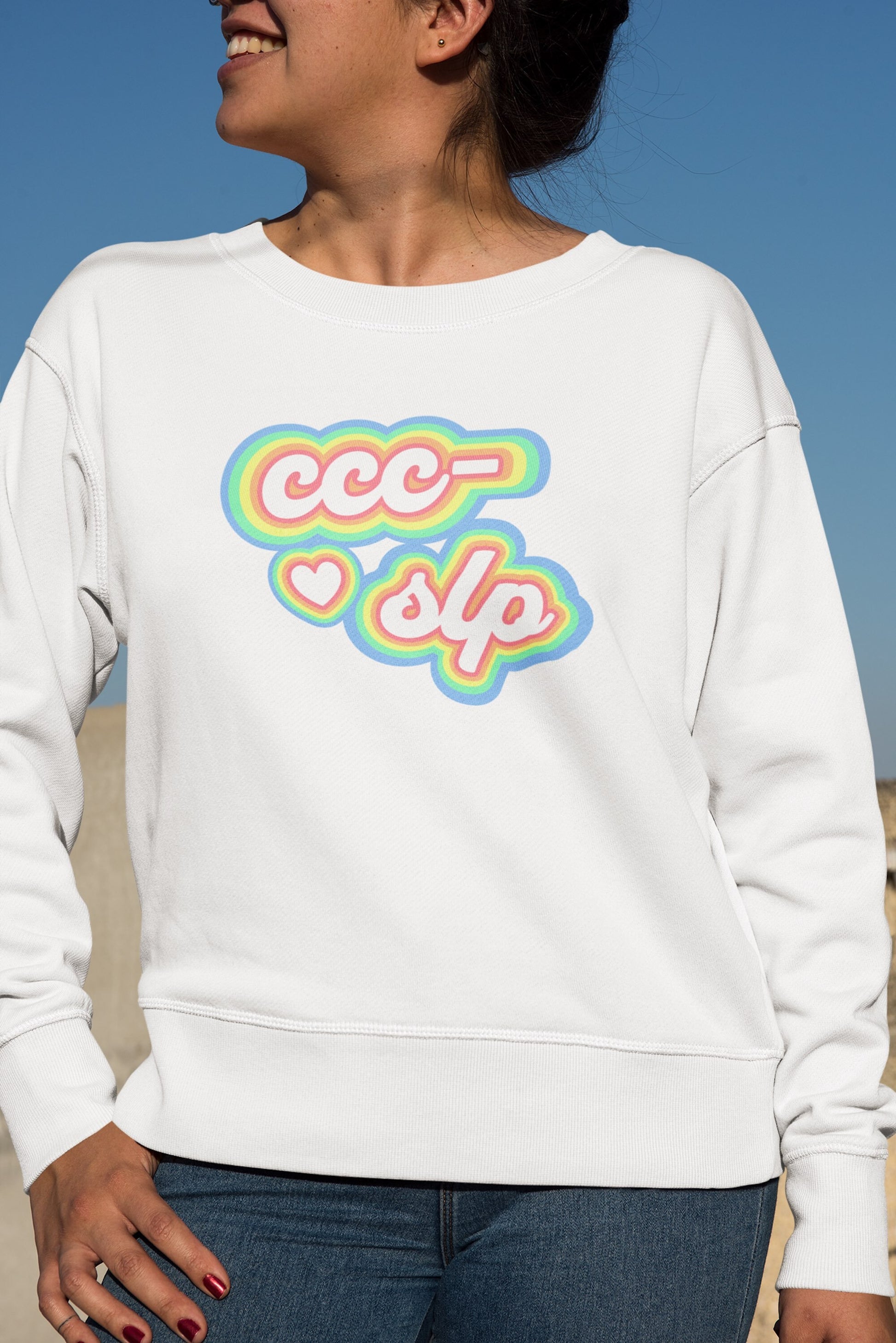✨This “CCC-SLP” pastel retro text Gildan 18000 unisex sweatshirt is an ideal gift for a speech-language pathologist (SLP), your favorite SLP supervisor, an SLP-to-be grad student, or yourself!