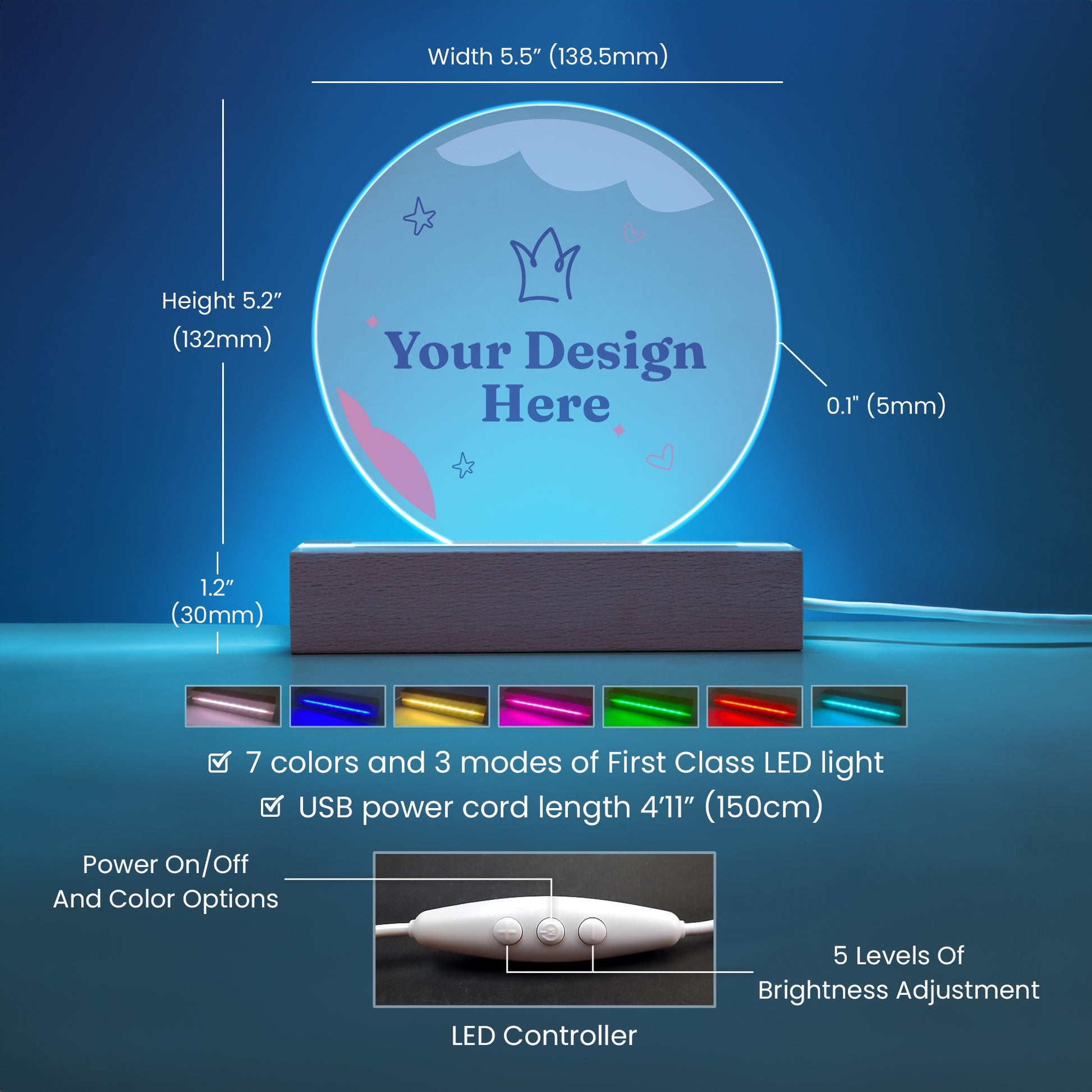- Wooden base with 7 color options with built-in LED lights