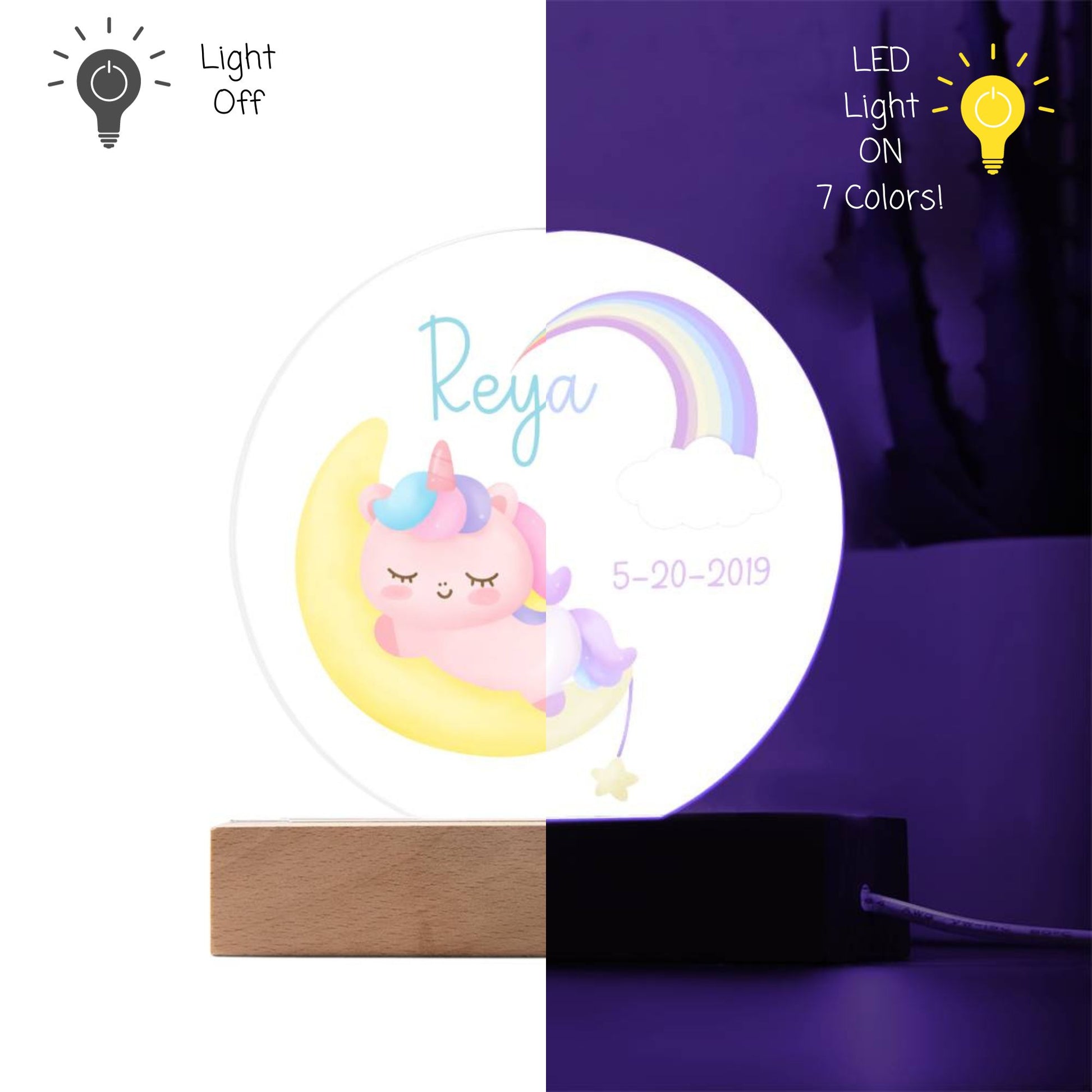 Custom Name and Birthdate Sleeping Unicorn Rainbow - LED Acrylic Night Light for Child