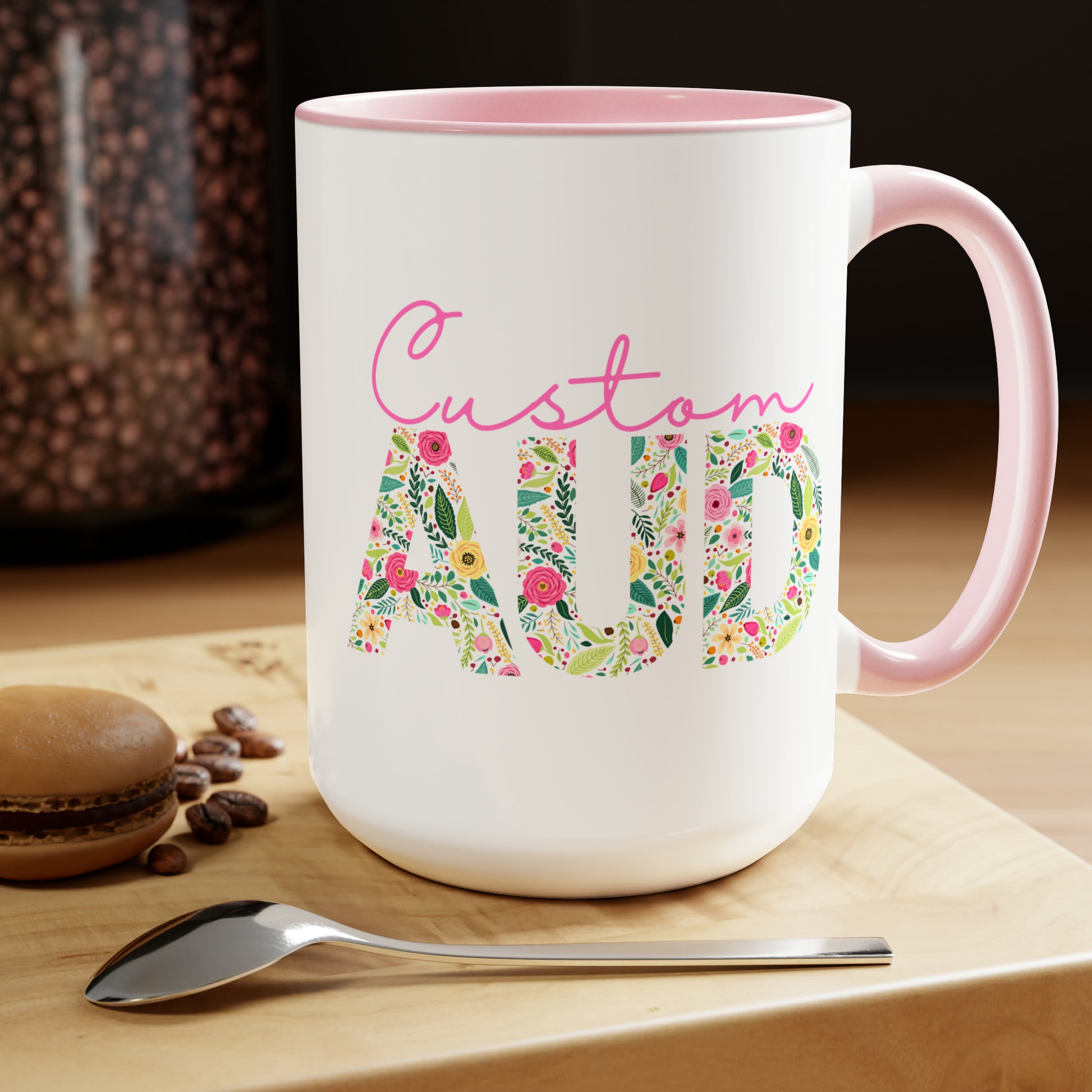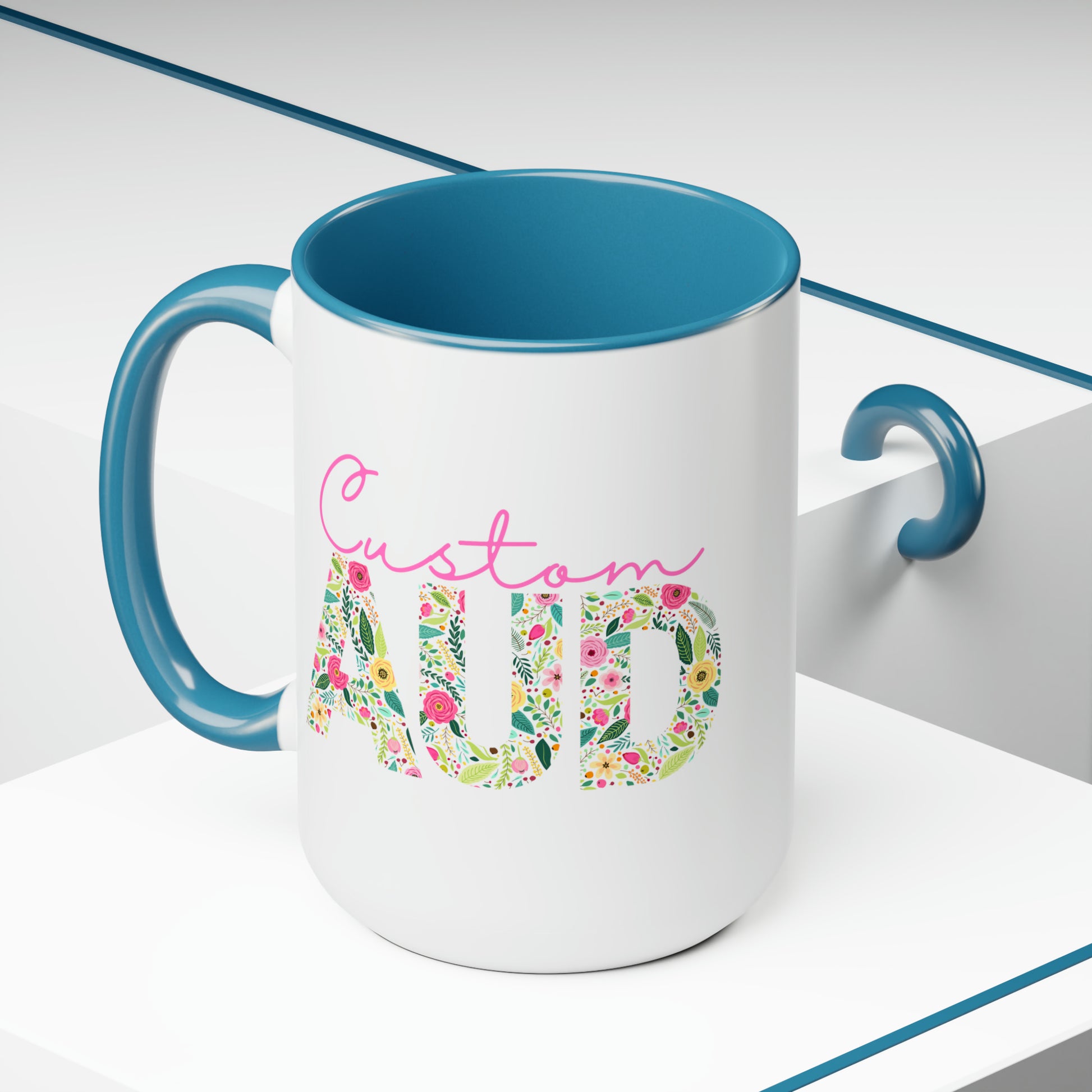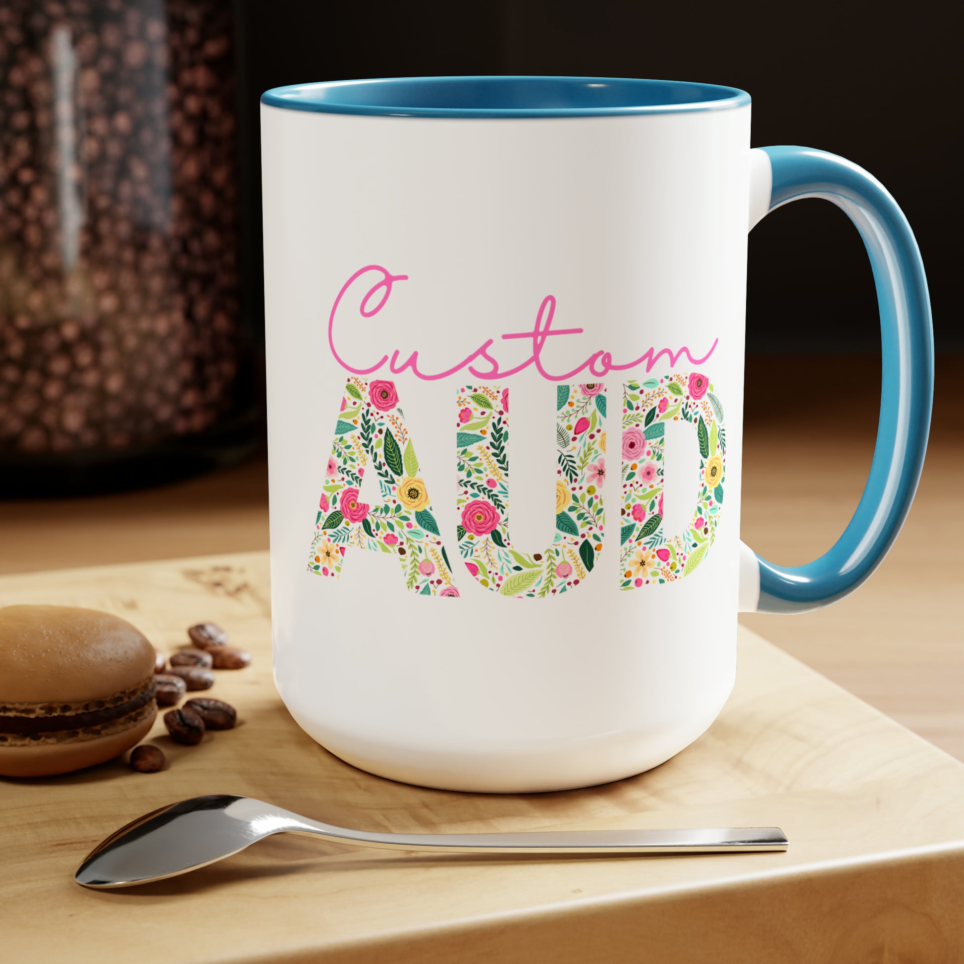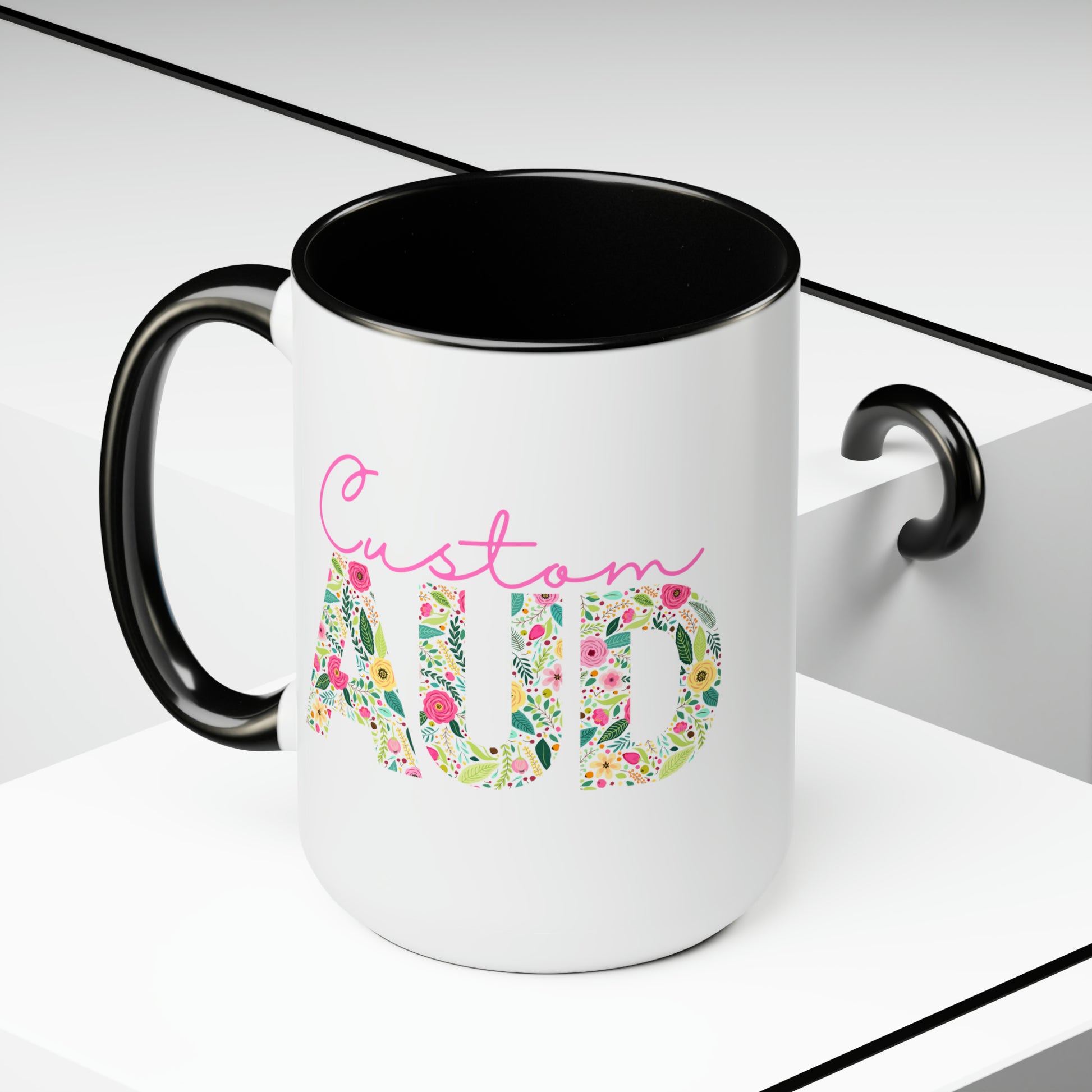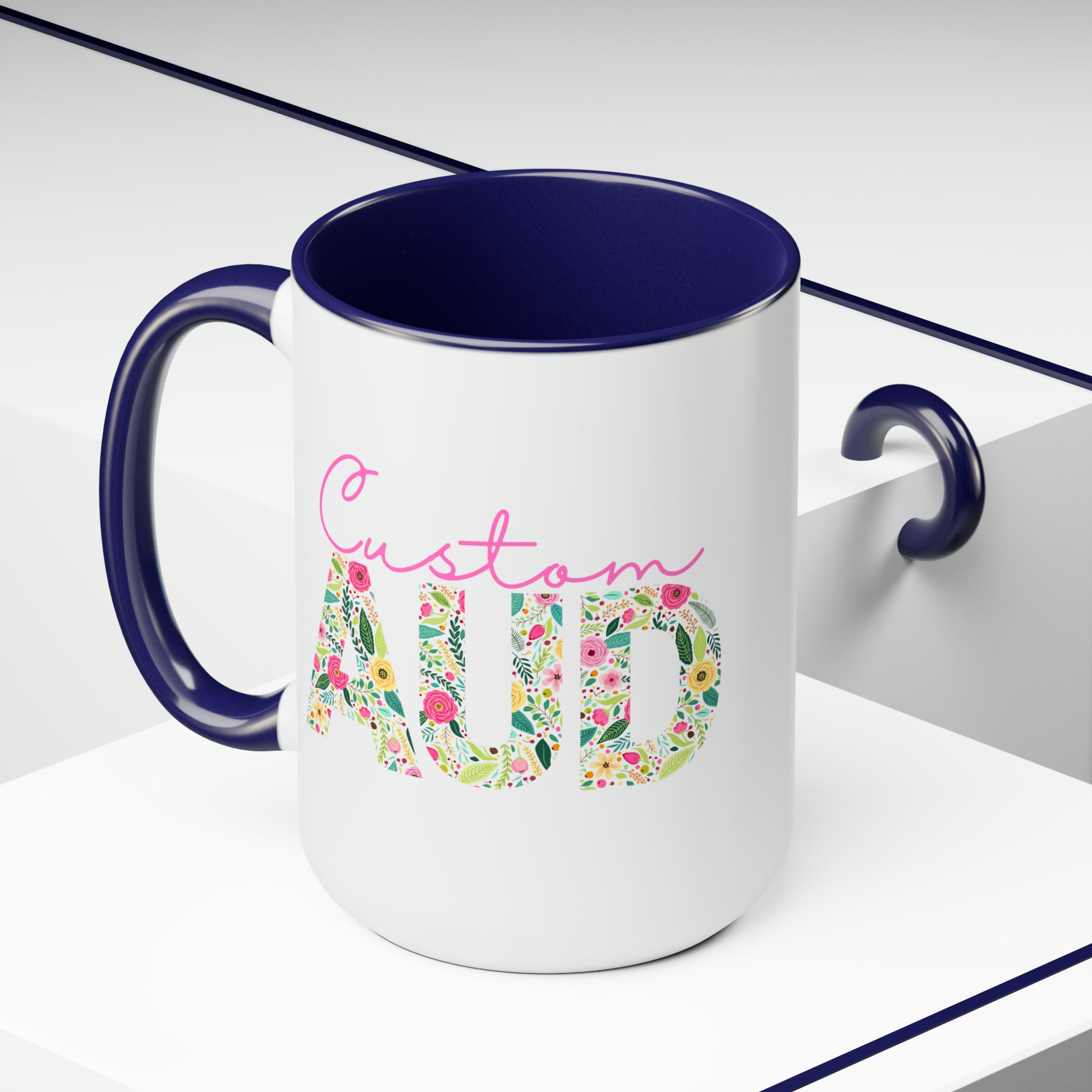 Custom Name Floral AUD Two-Tone Mug Gift, 15 oz.