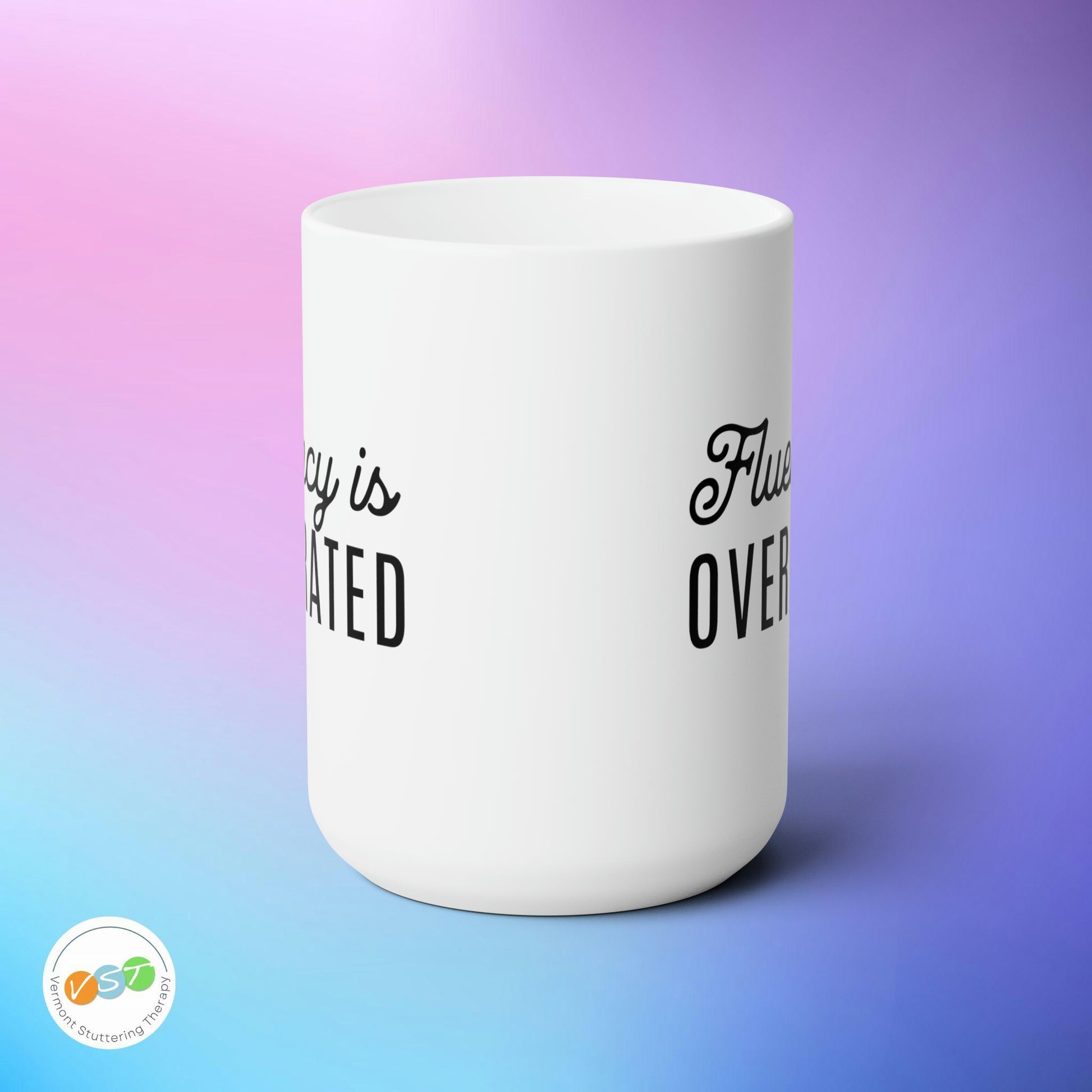 This minimalist "Fluency is Overrated" 15 oz white mug is perfect for a stuttering advocate, a parent or family member, or friend who stutters! It's a great way to support Team Stuttering and Normalize Stuttering movement, with a reminder that it's ok to stutter.