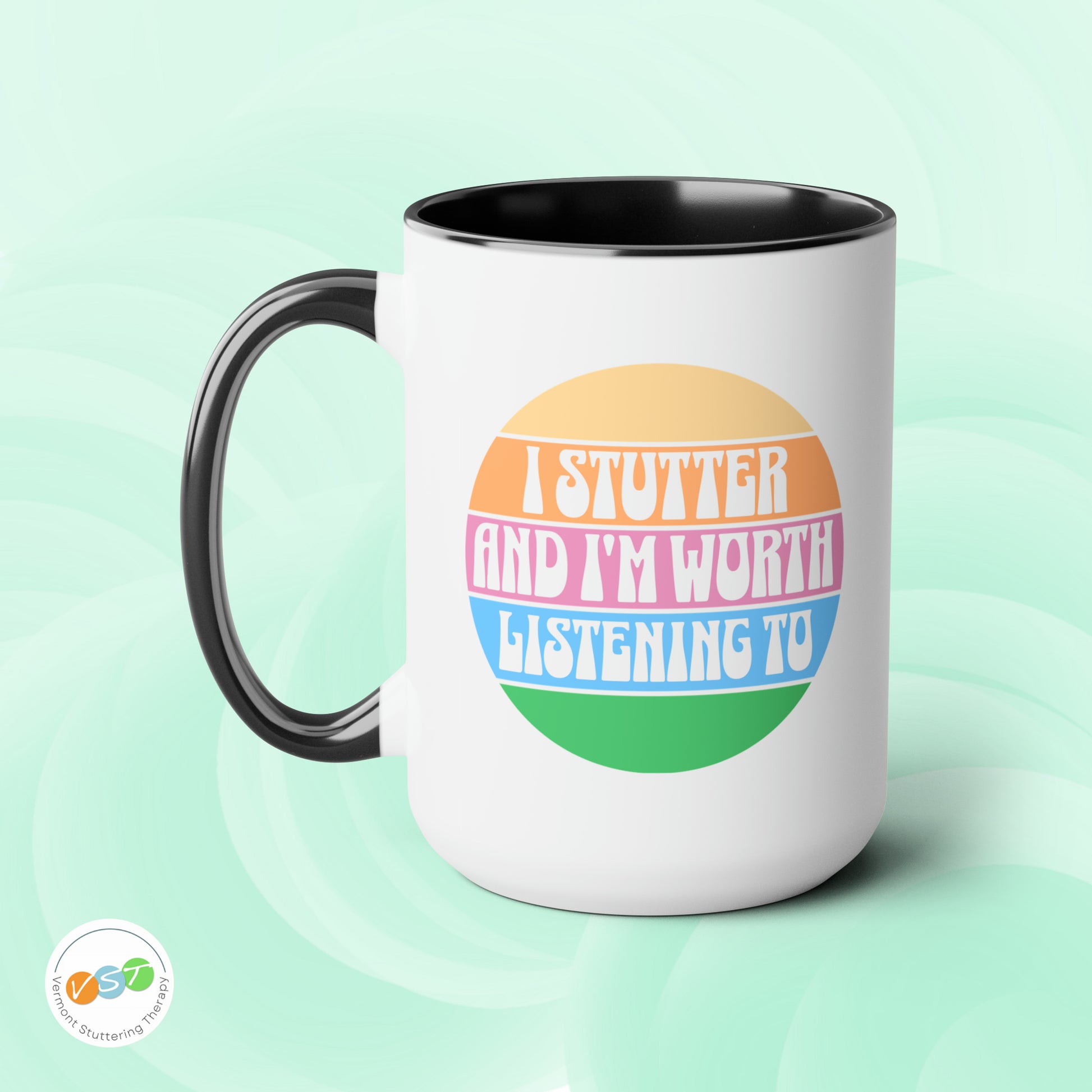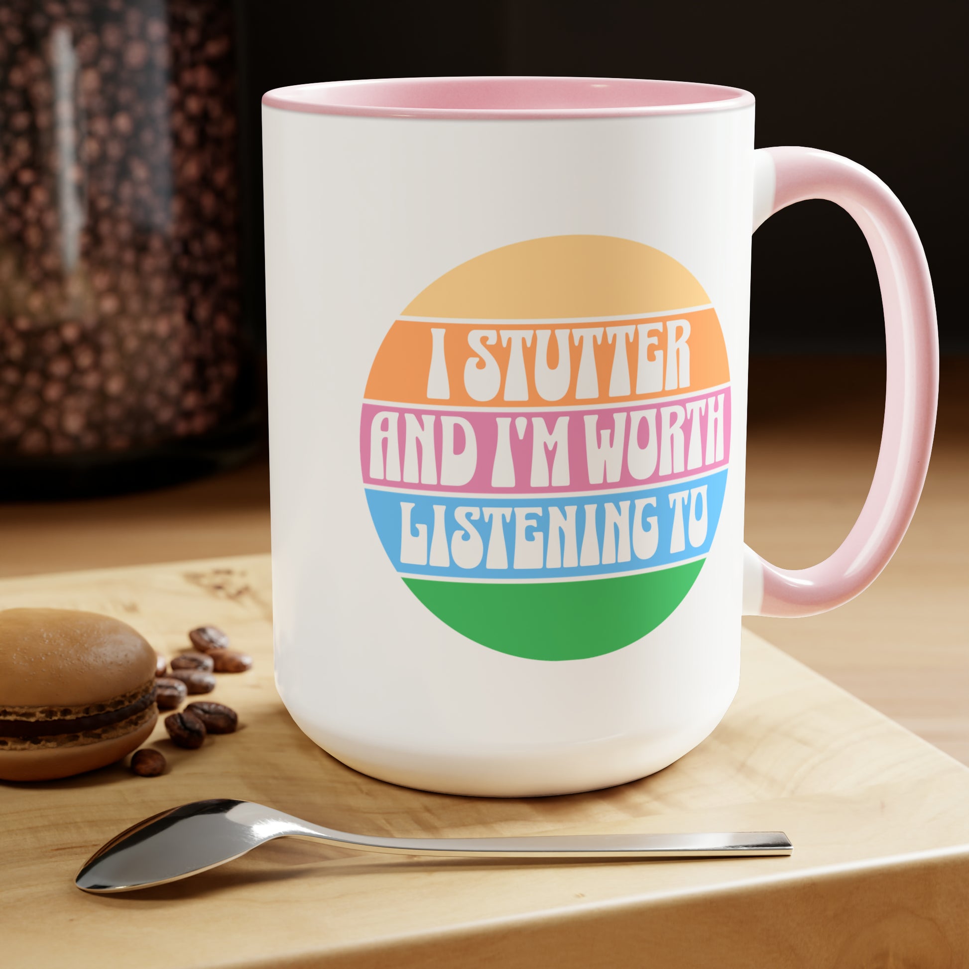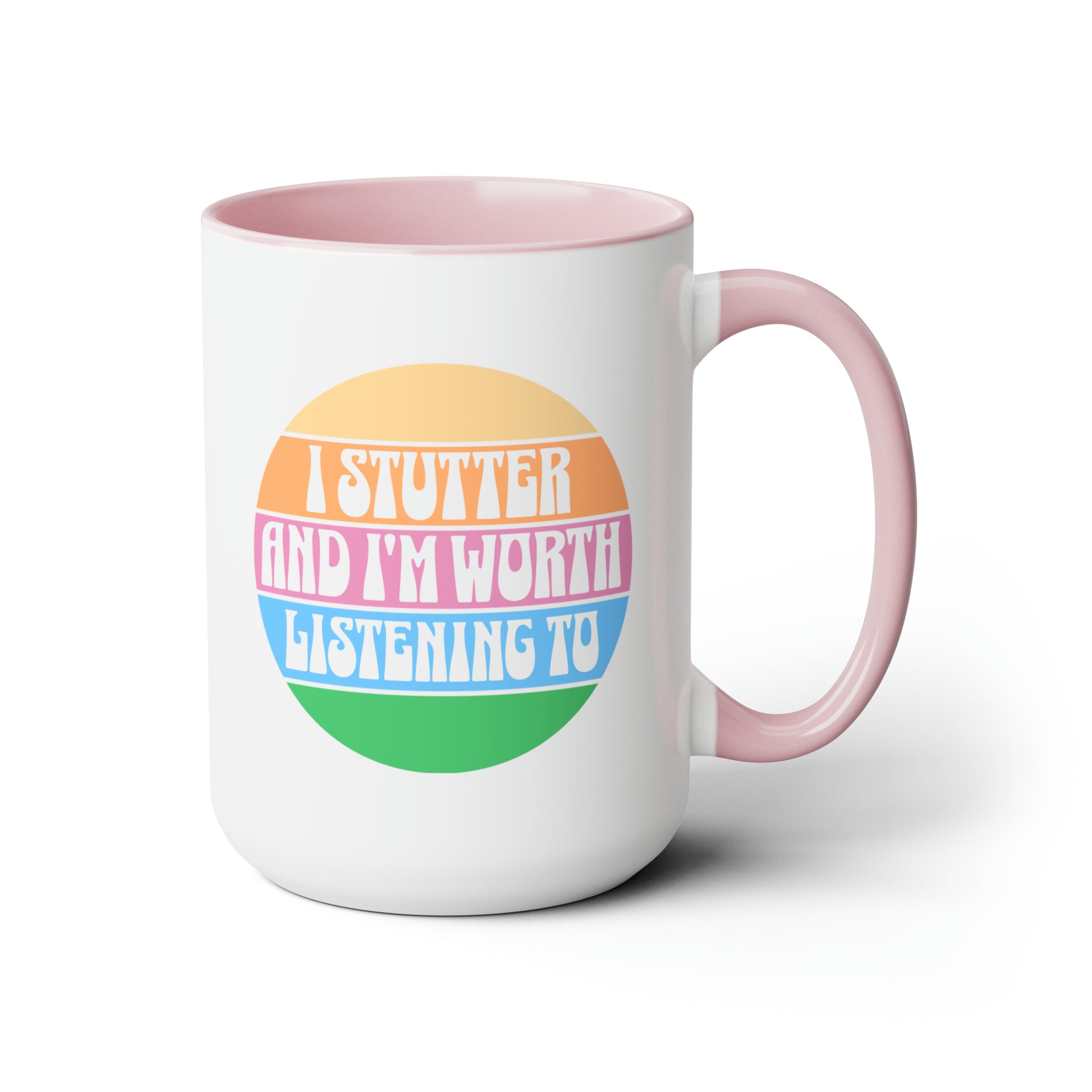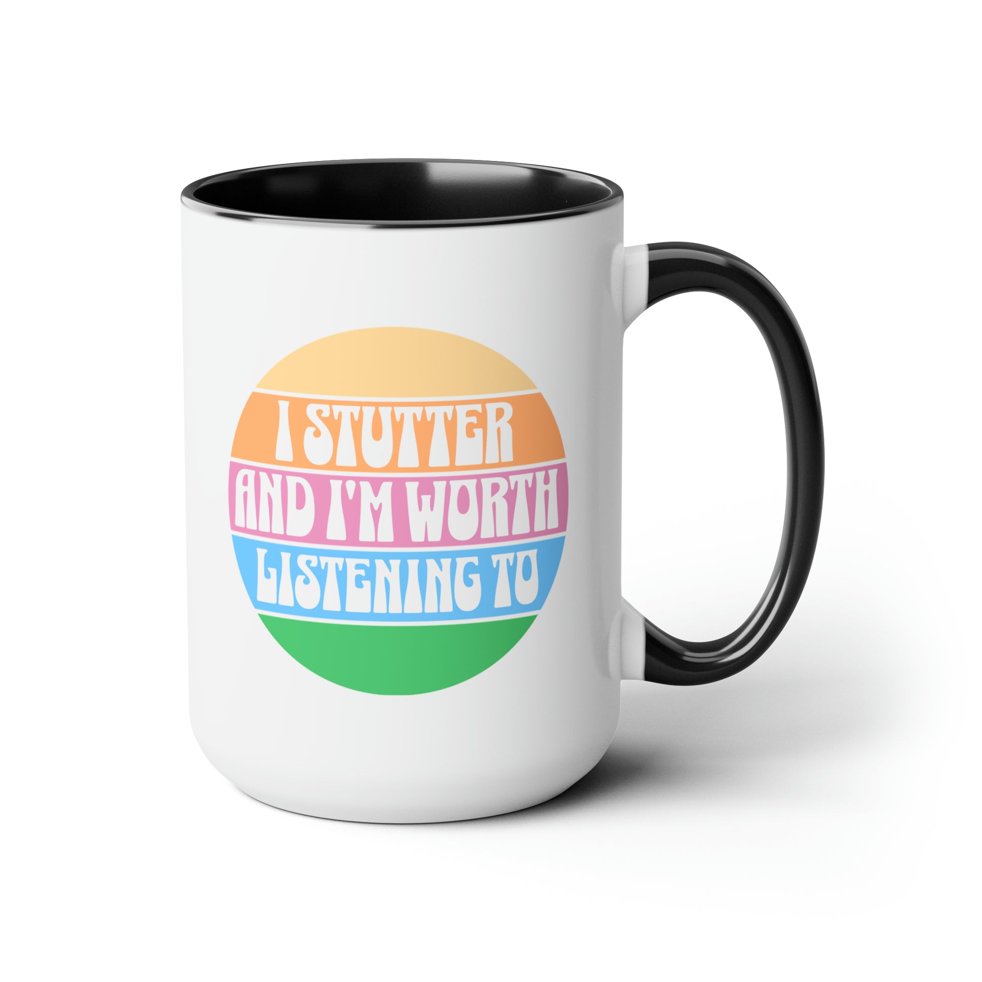 People who stutter can start their morning off right with this retro sun two-tone "I Stutter and I'm Worth Listening To" coffee mug. This is the perfect gift for the person who stutters or stuttering ally in your life to support the mission to Normalize Stuttering (#normalizestutteringchallenge)!