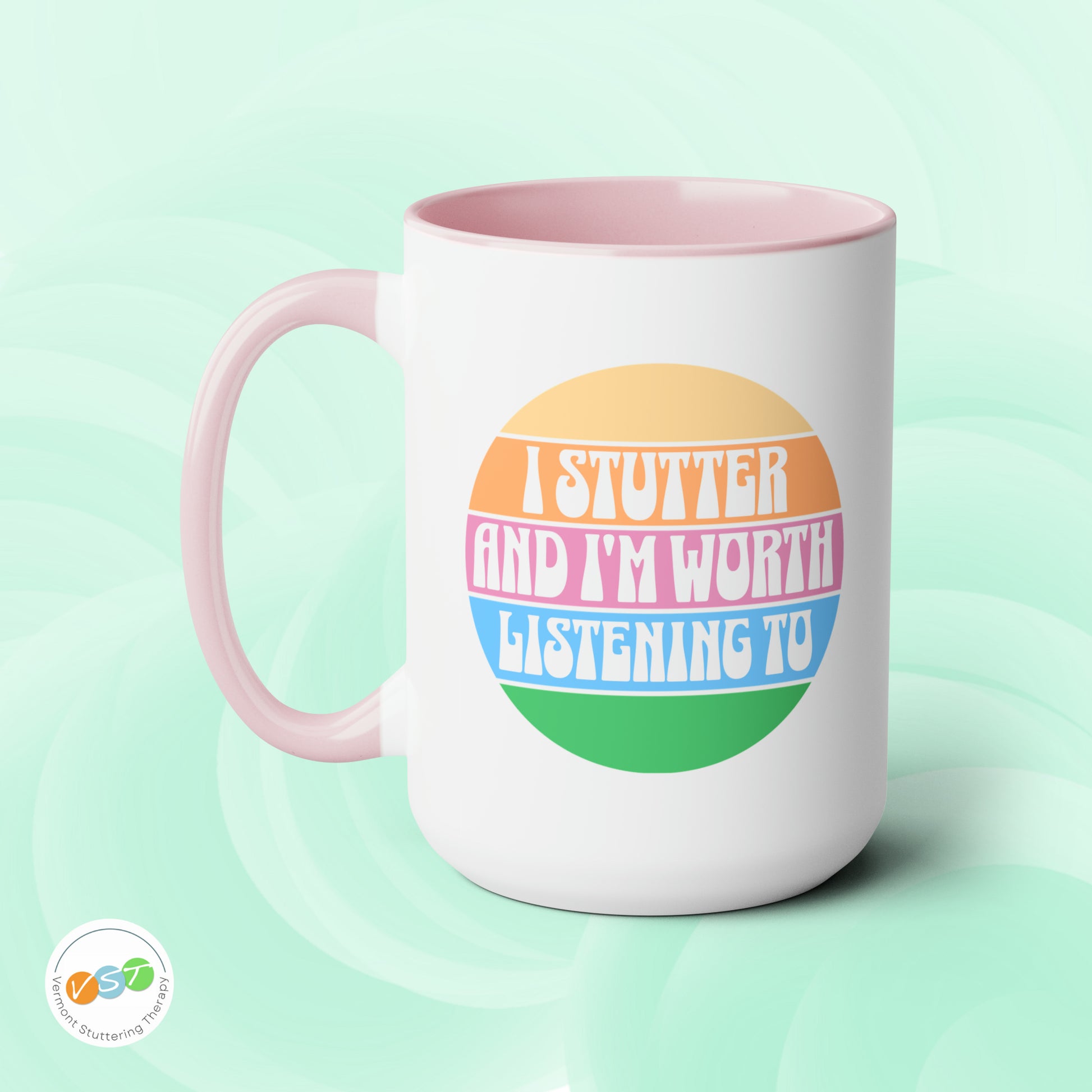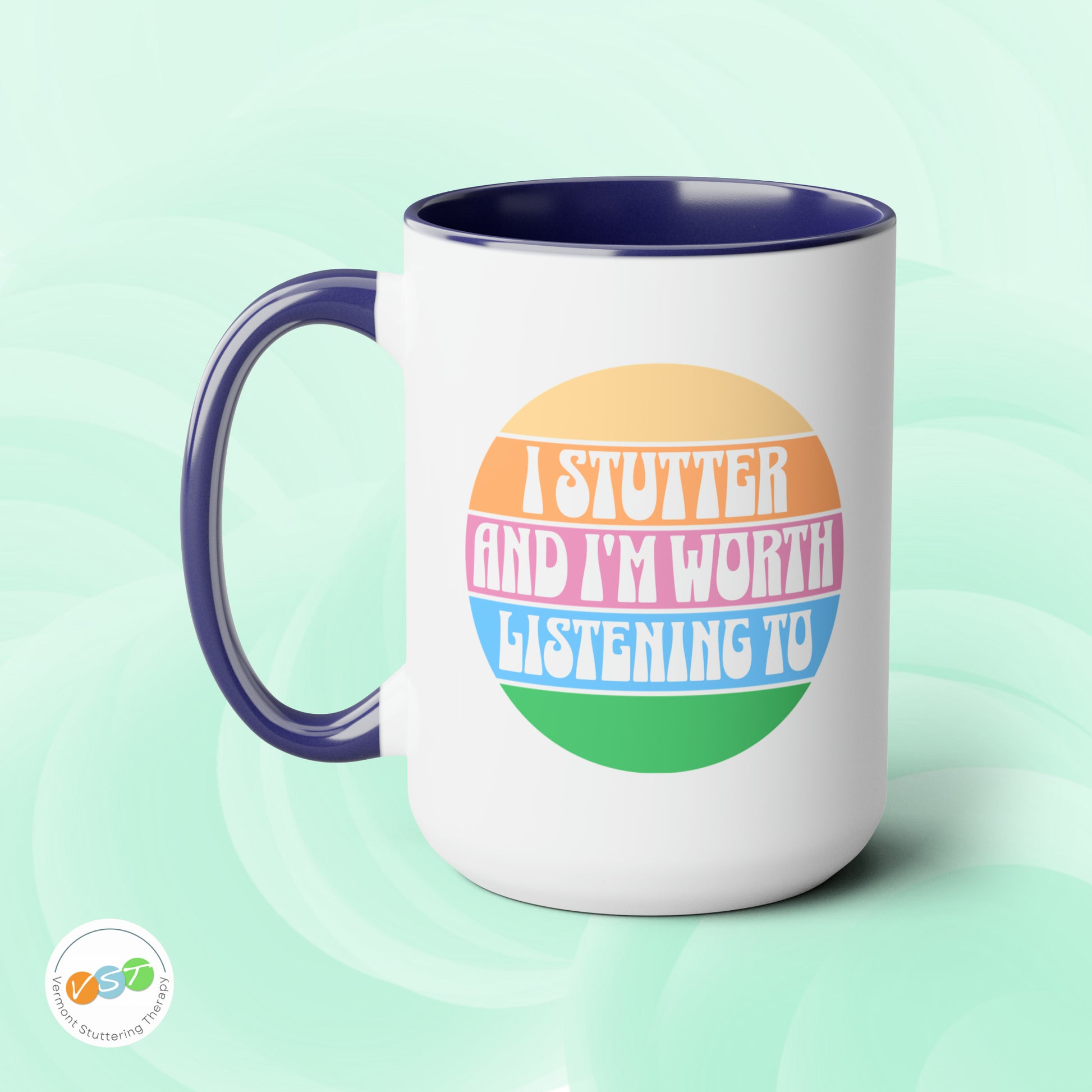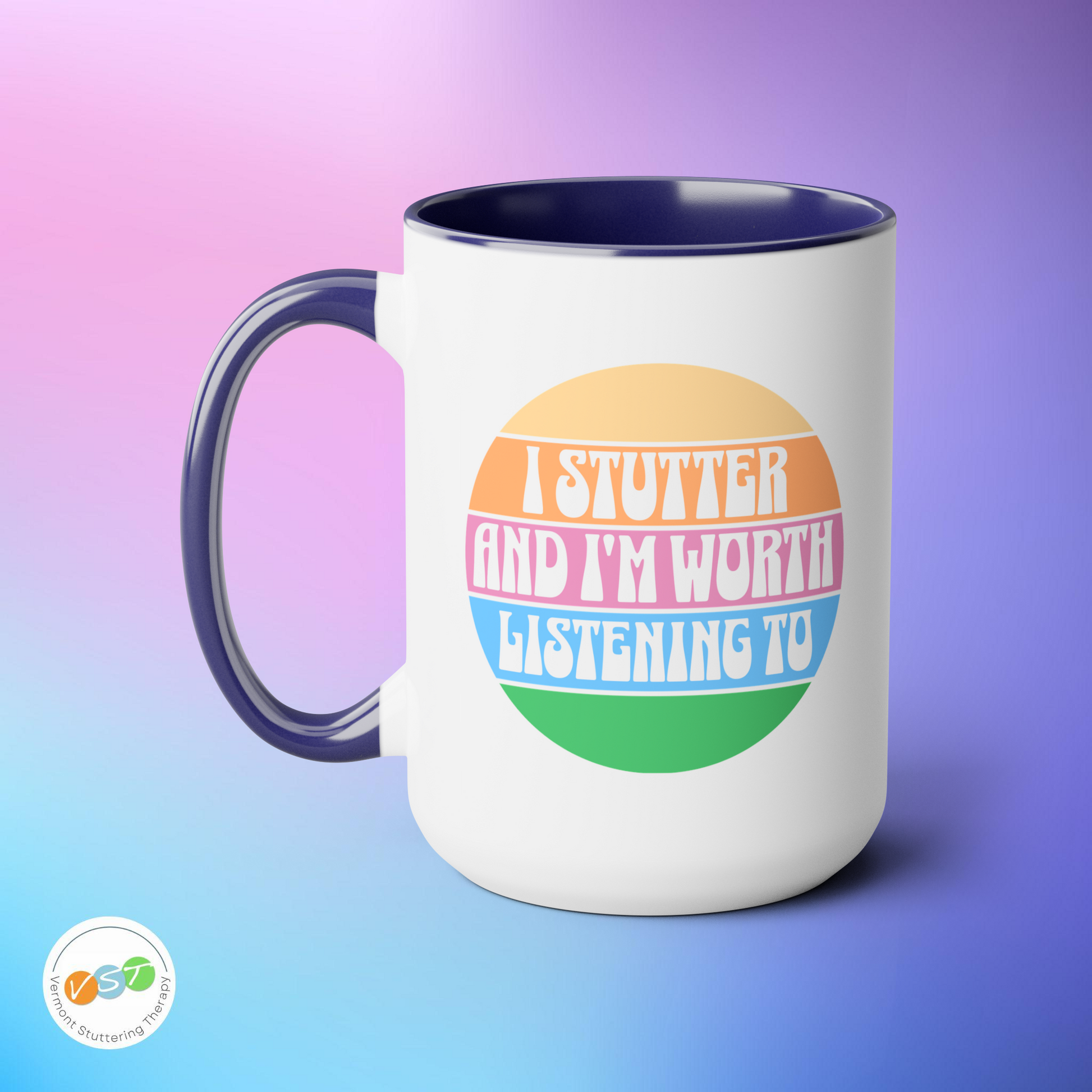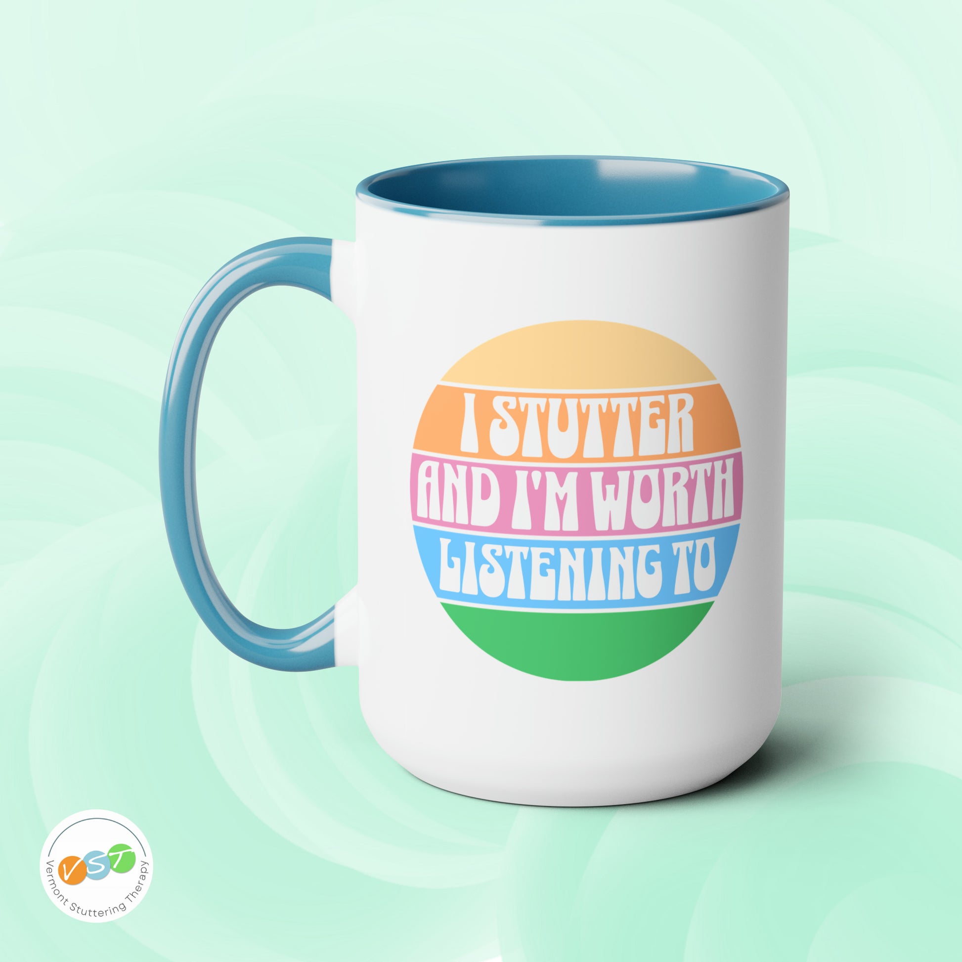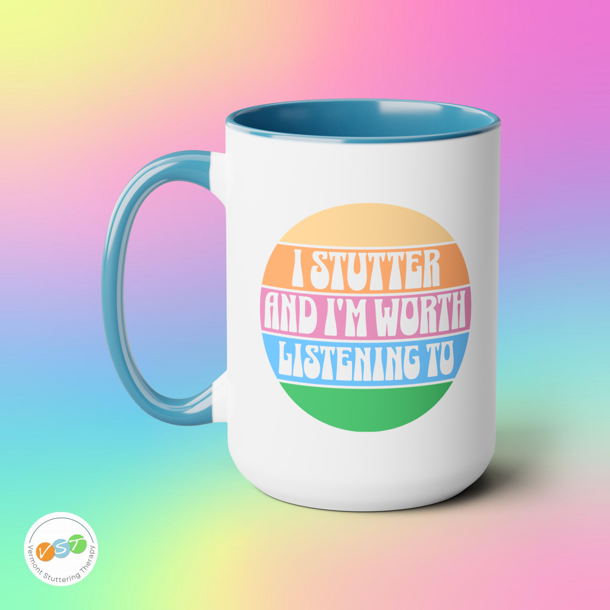 People who stutter can start their morning off right with this retro sun two-tone "I Stutter and I'm Worth Listening To" coffee mug. This is the perfect gift for the person who stutters or stuttering ally in your life to support the mission to Normalize Stuttering (#normalizestutteringchallenge)!
