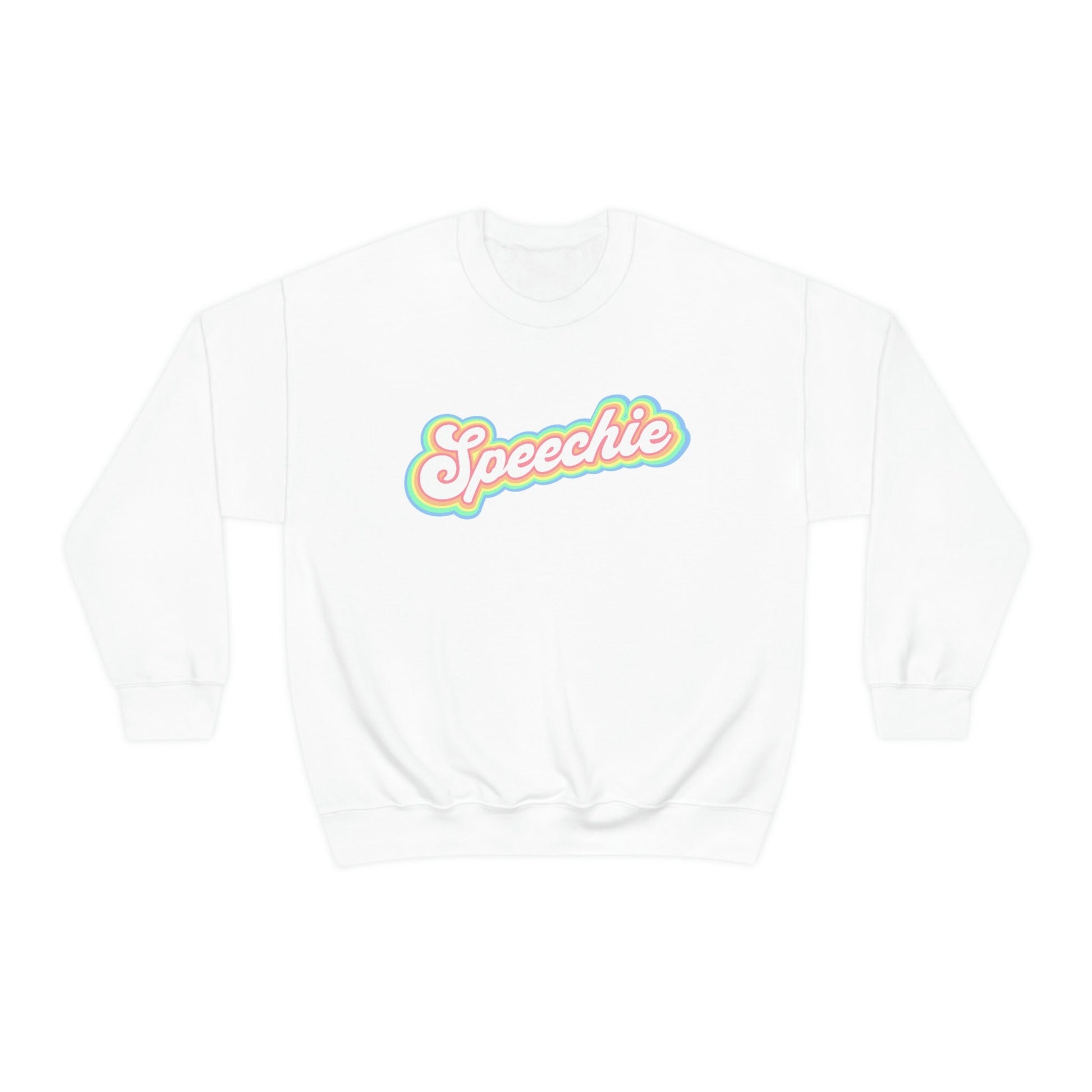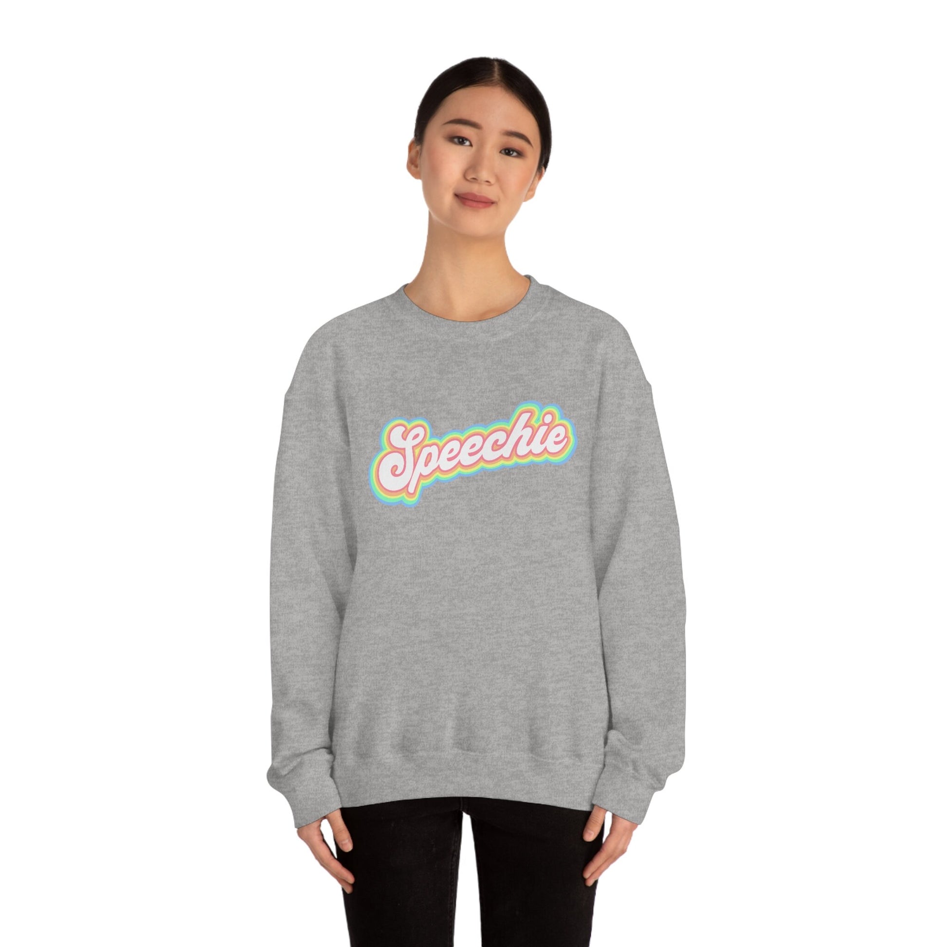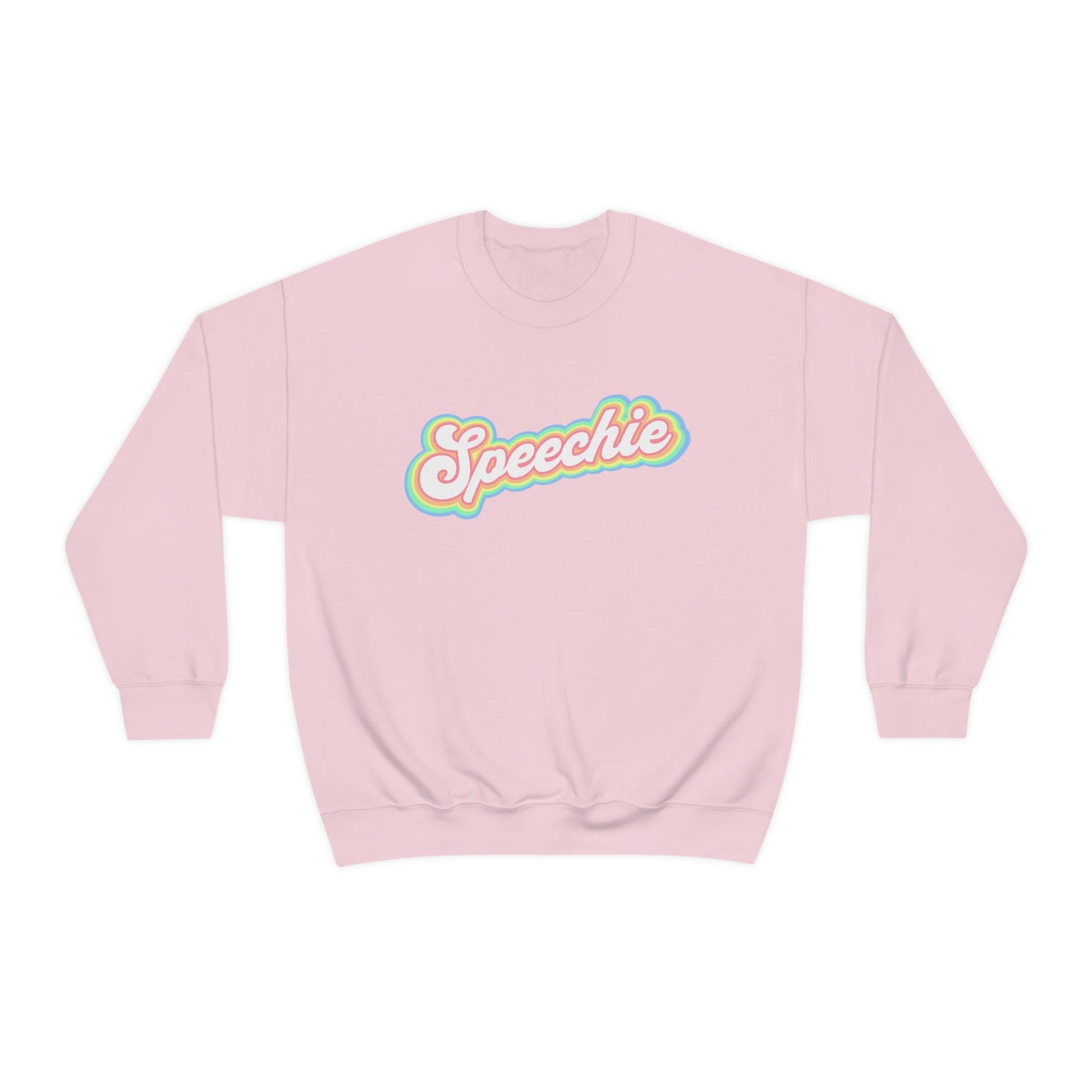 ✨This “Speechie” Gildan 18000 unisex pastel retro font sweatshirt is an ideal gift for a speech-language pathologist (SLP) or SLP-to-be grad student.