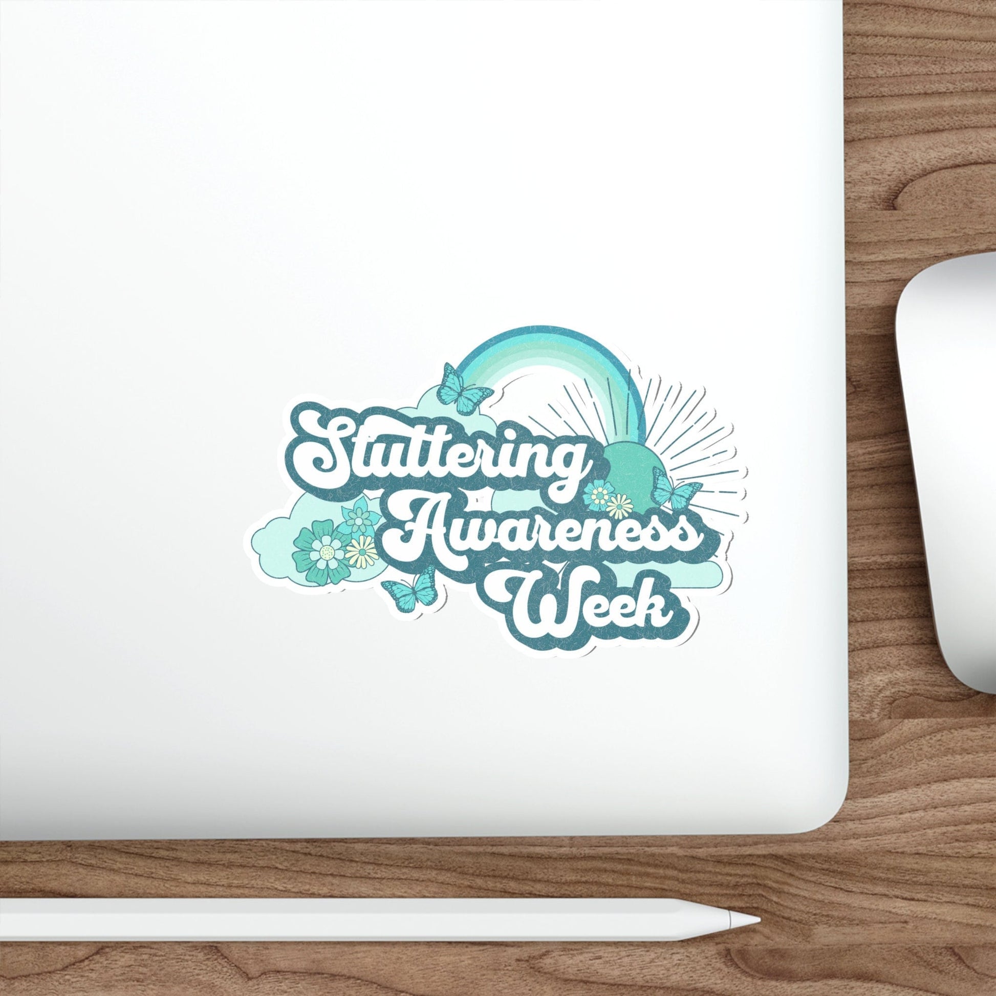 This die-cut vinyl matte finish "Stuttering Awareness Week" retro sea green/blue sticker on white background is the perfect gift for your favorite person who stutters in your life, or for yourself!