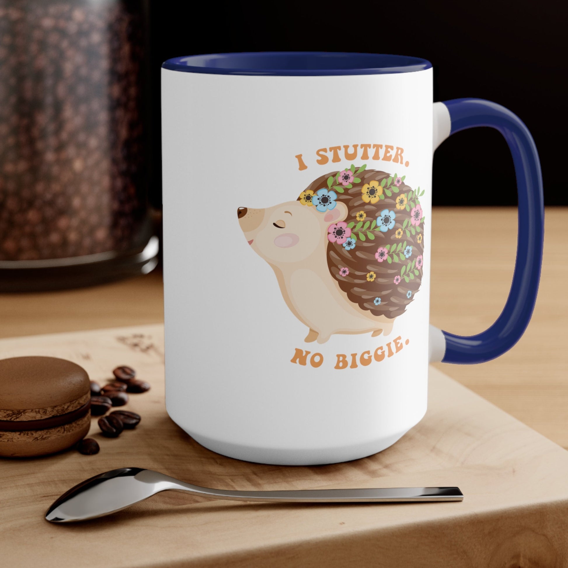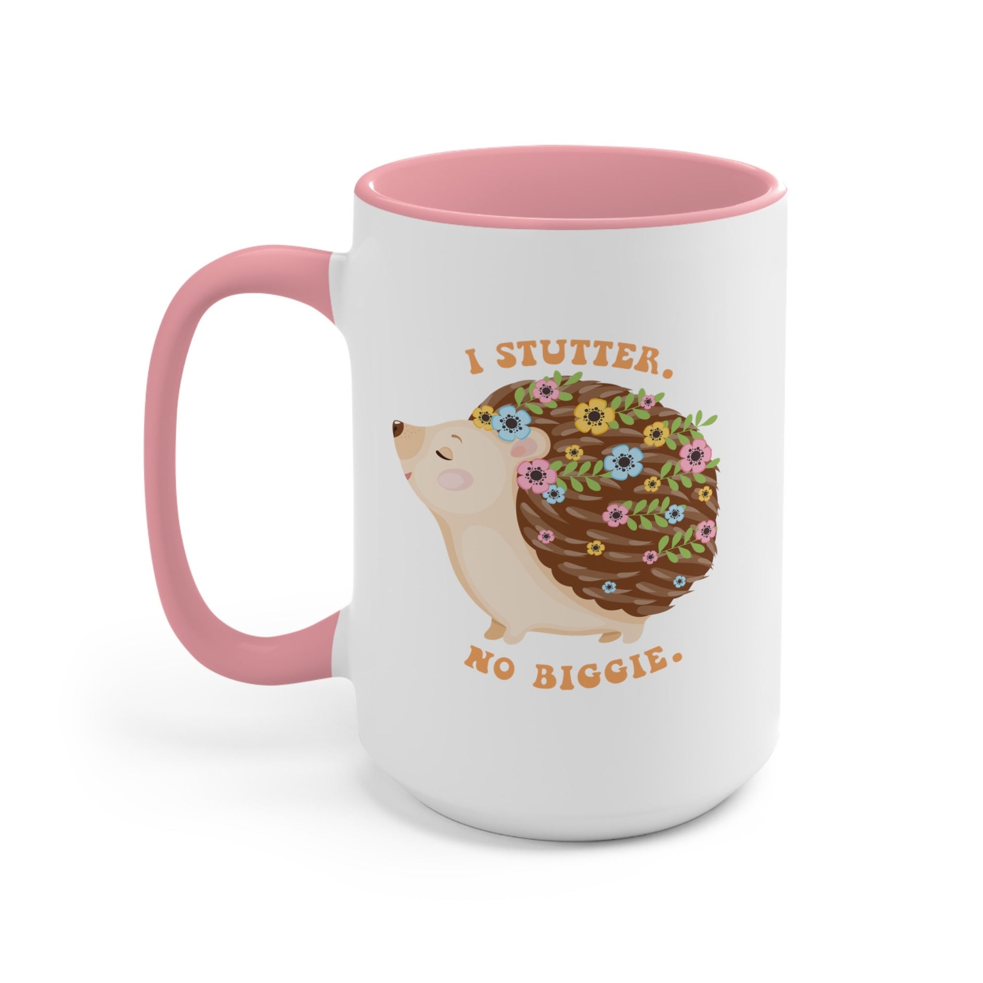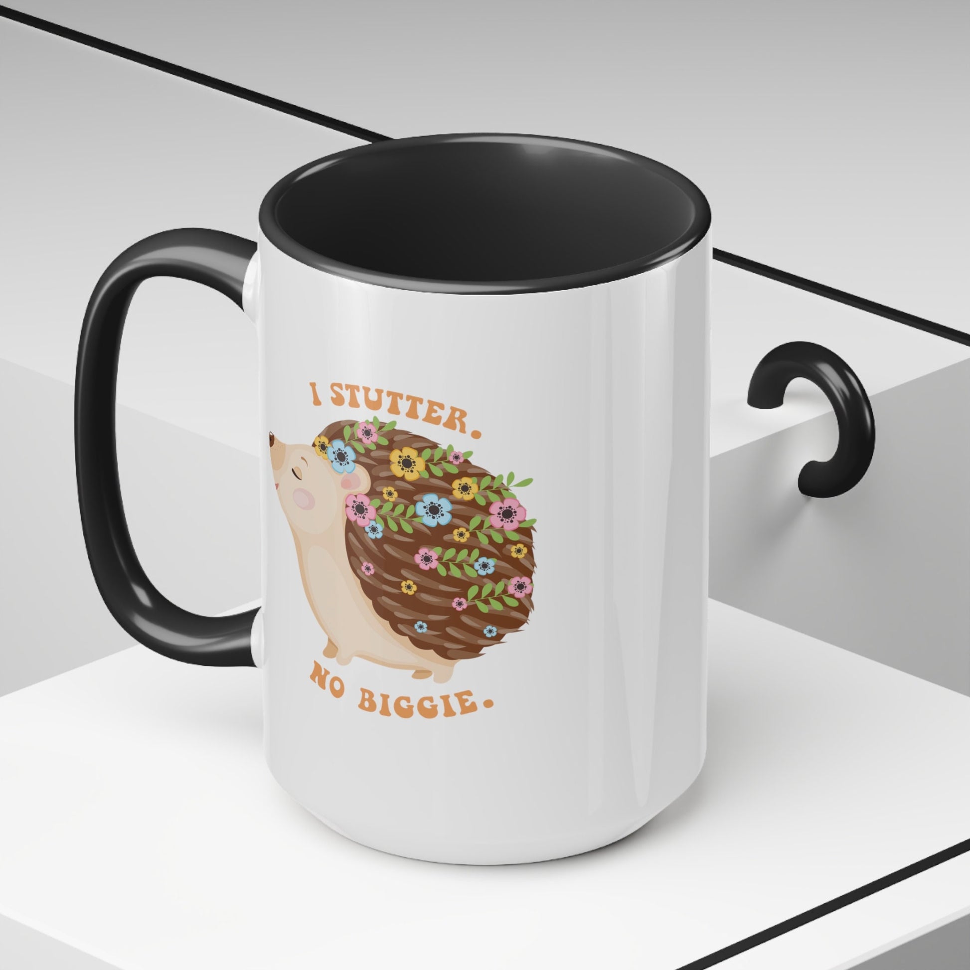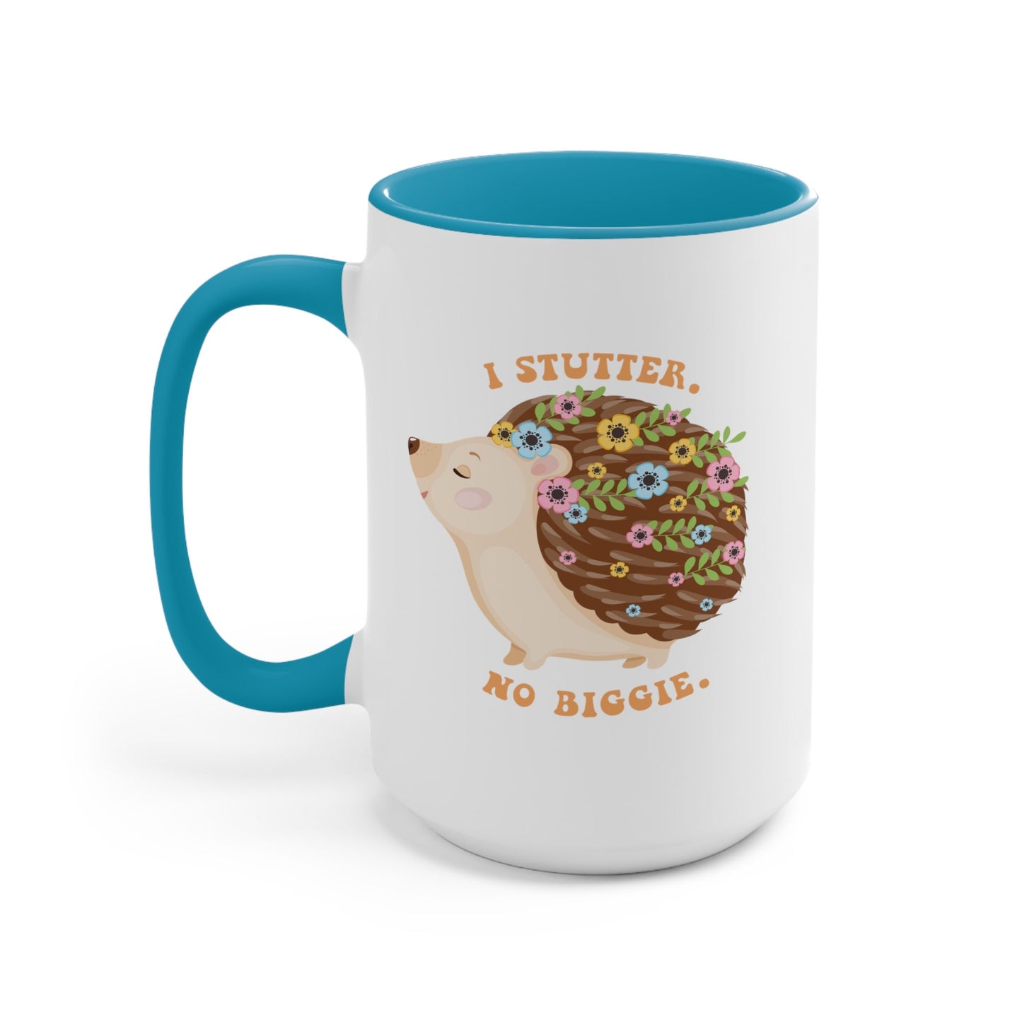 People who stutter and their allies can start their morning off right with this cute two-tone hedgehog "I stutter. No biggie." coffee mug. This is the perfect gift for the person who stutters or stuttering ally in your life to support the mission to Normalize Stuttering!