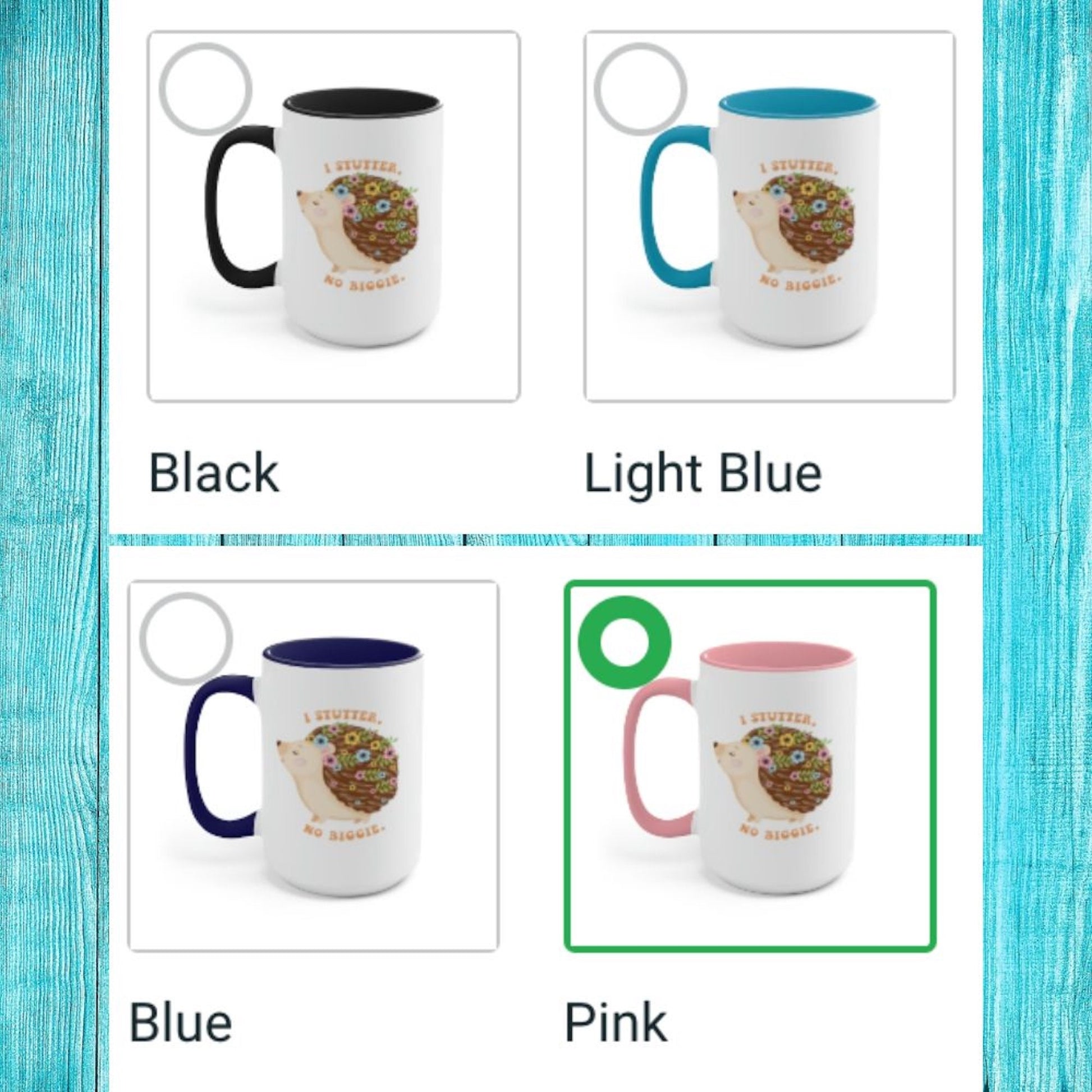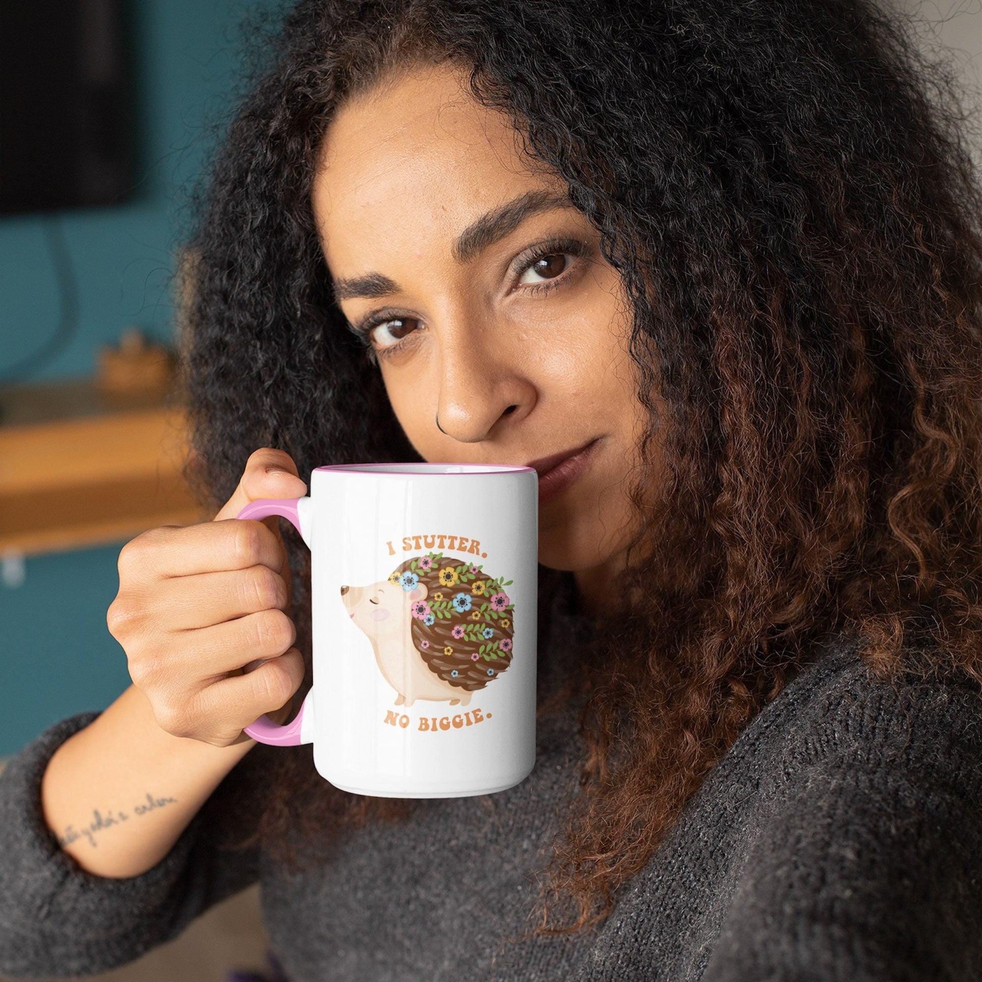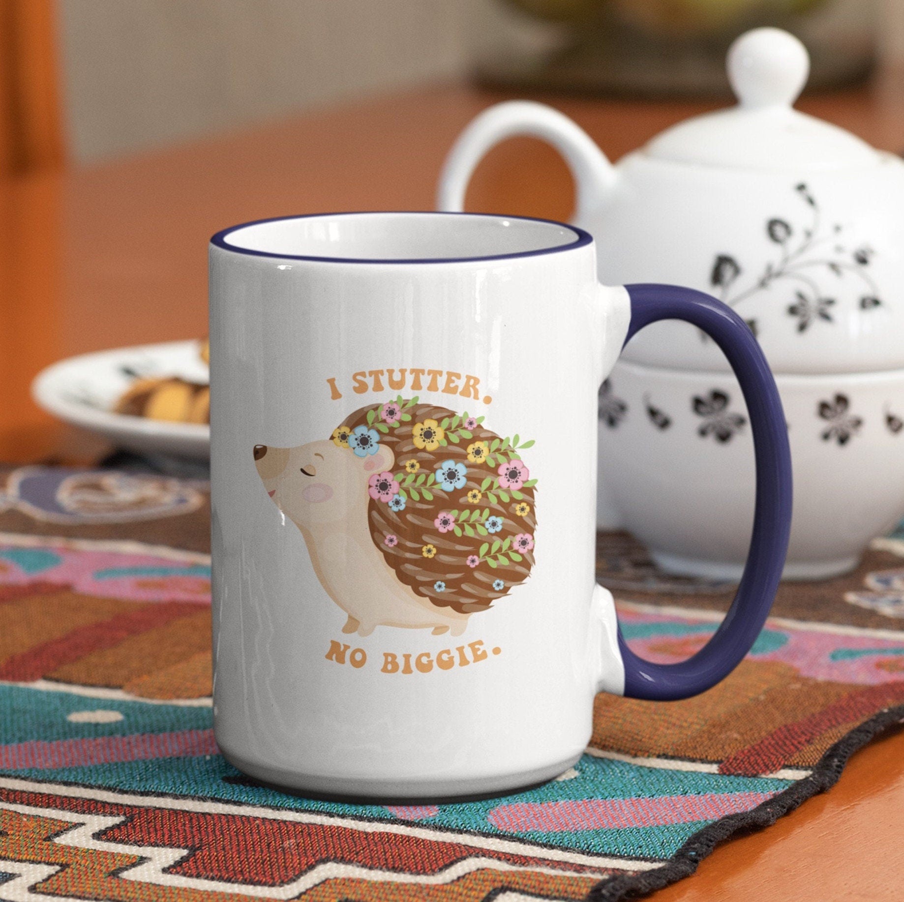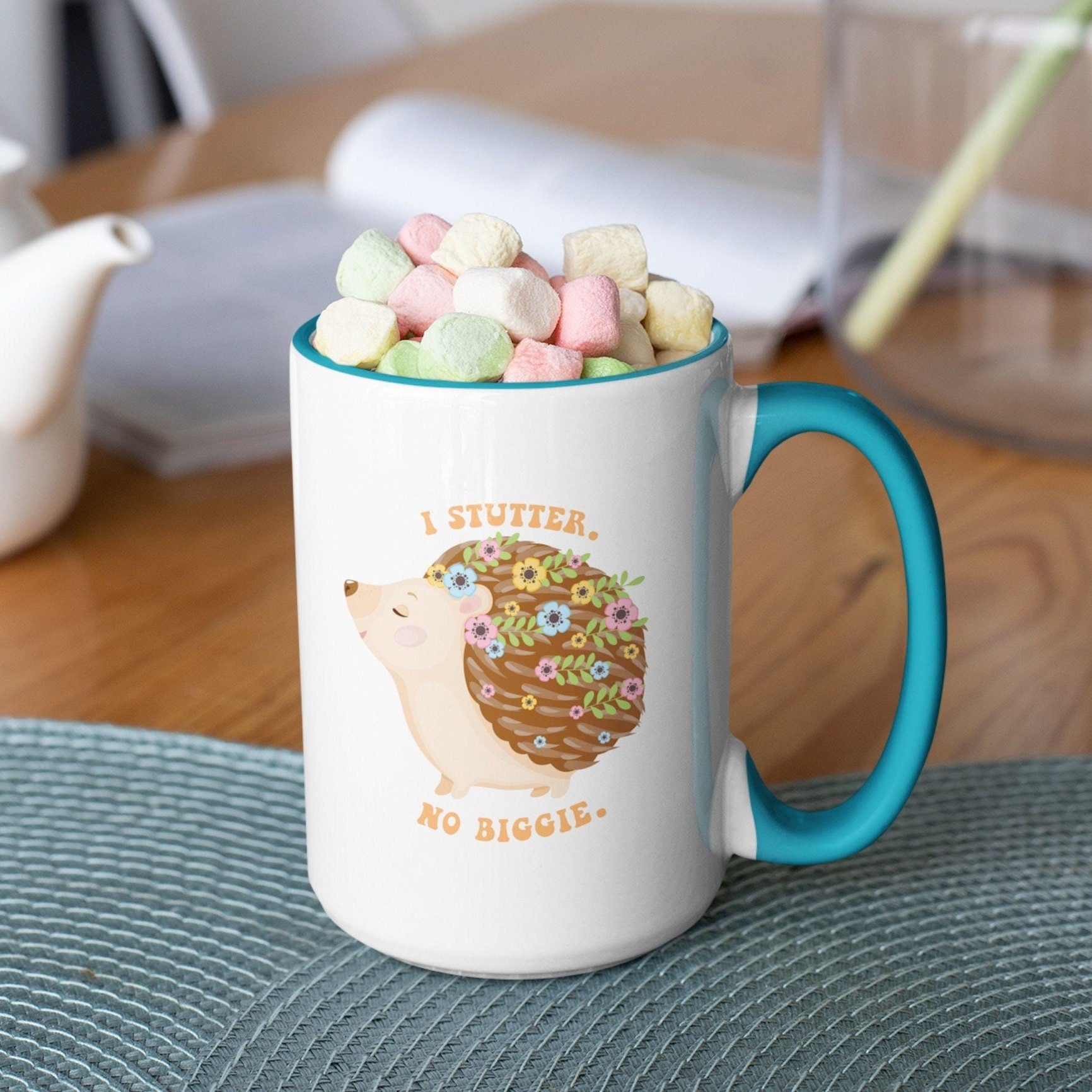 People who stutter and their allies can start their morning off right with this cute two-tone hedgehog "I stutter. No biggie." coffee mug. This is the perfect gift for the person who stutters or stuttering ally in your life to support the mission to Normalize Stuttering!