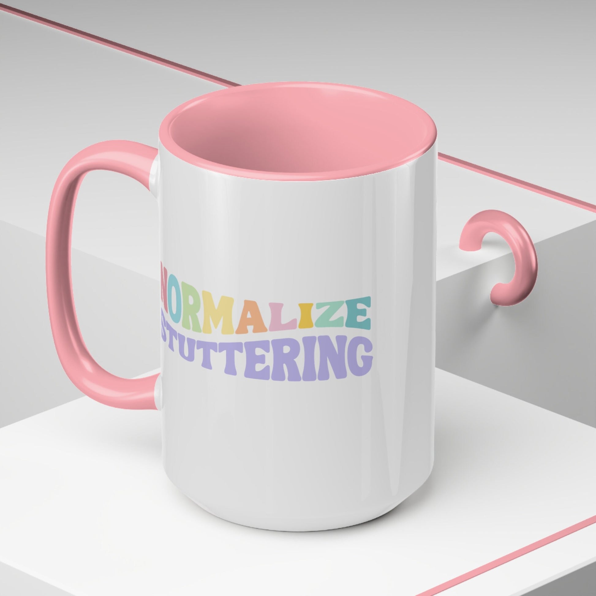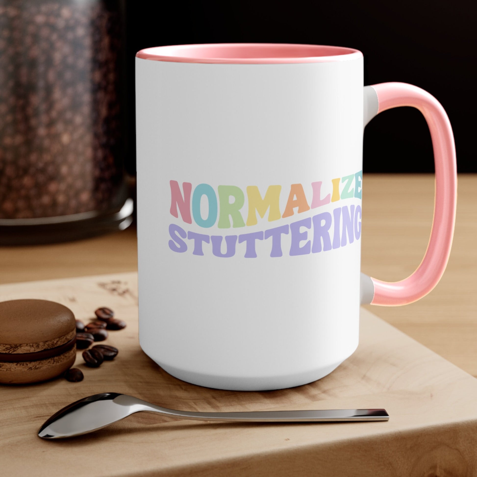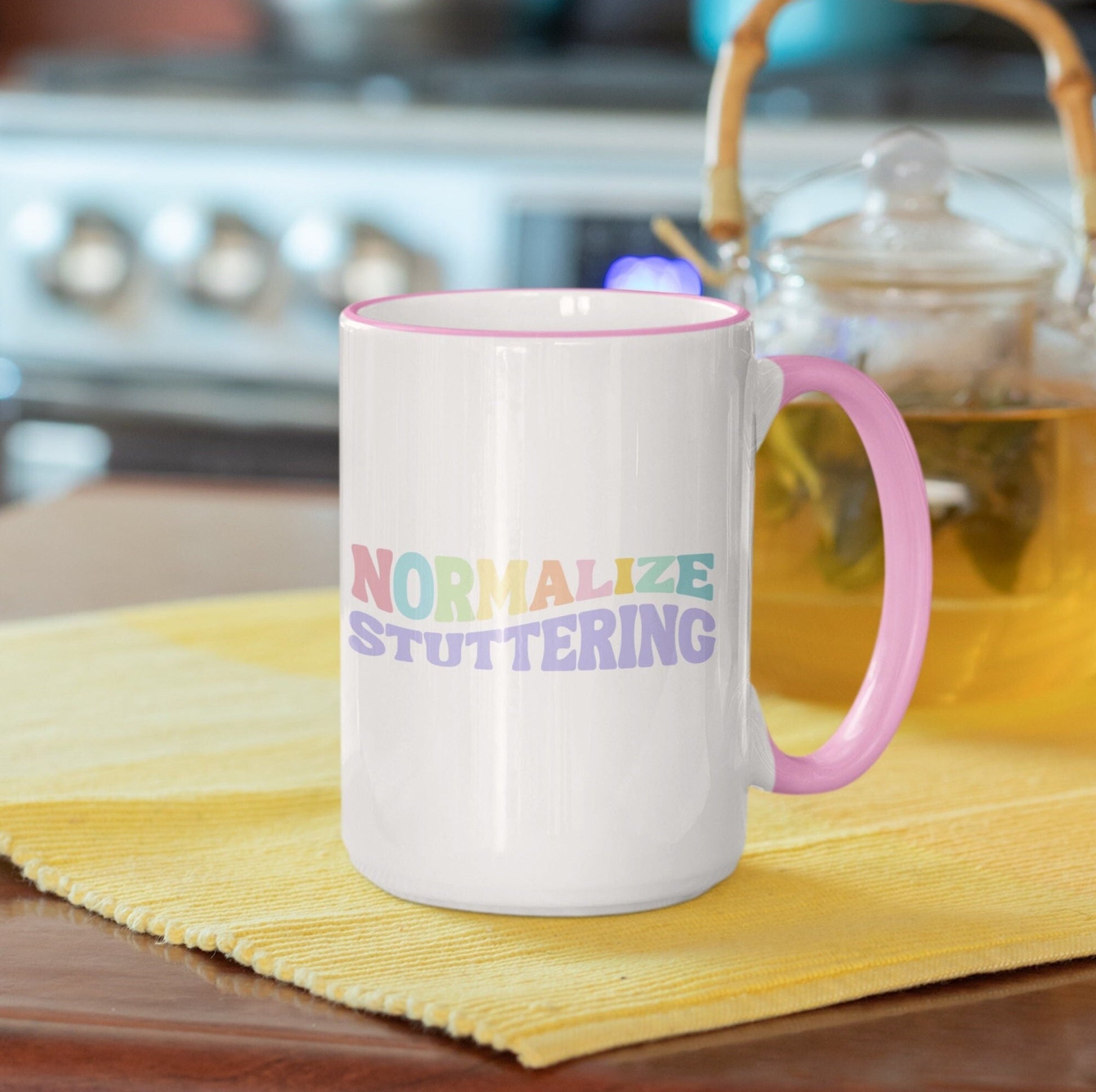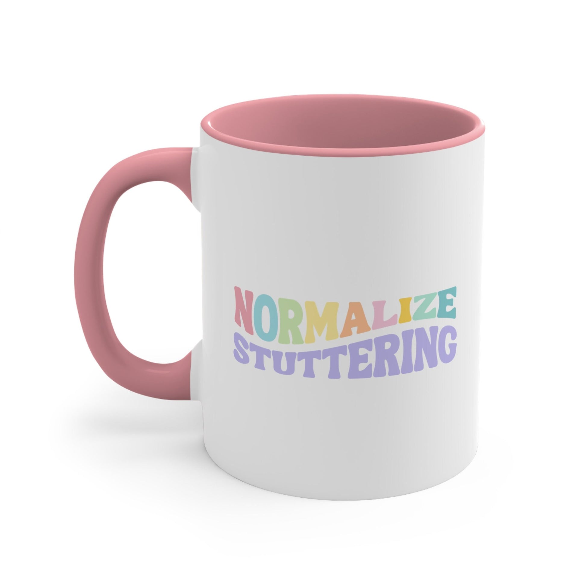 People who stutter and their allies can start their morning off right with this cute two-tone white/pink Normalize Stuttering retro wave coffee mug. This 11 or 15 oz mug is the perfect gift for the person who stutters or stuttering ally in your life to support the mission to normalize stuttering!