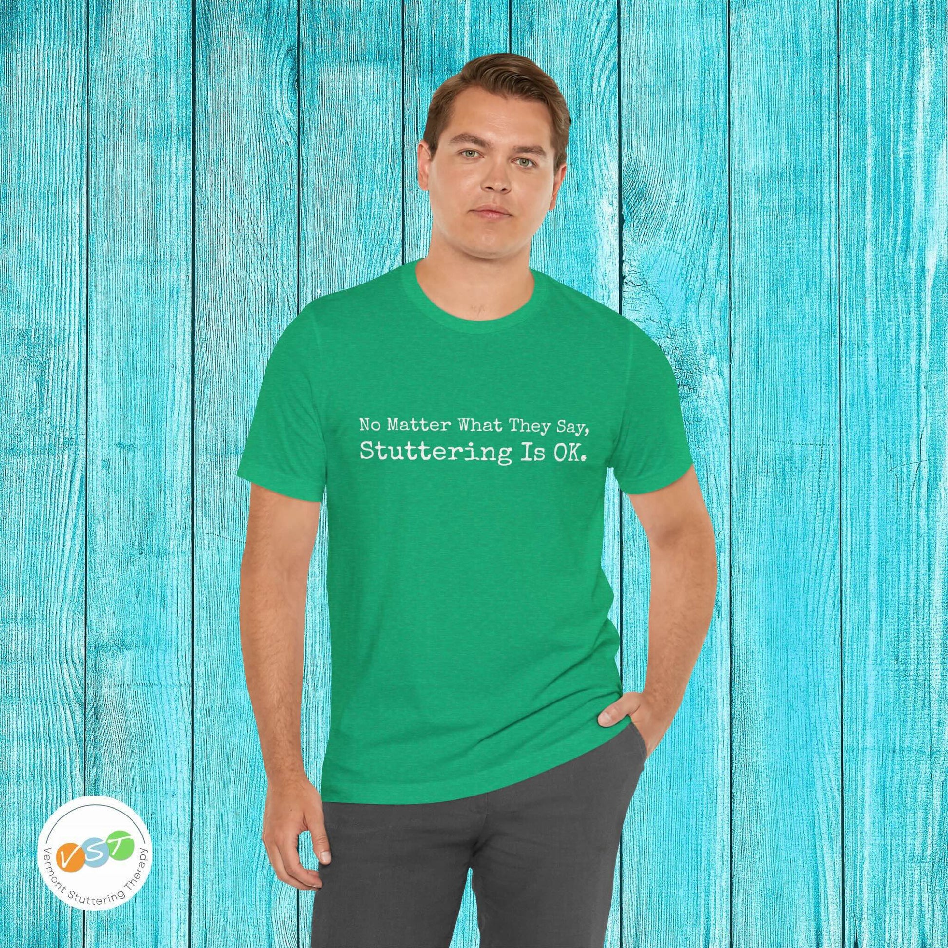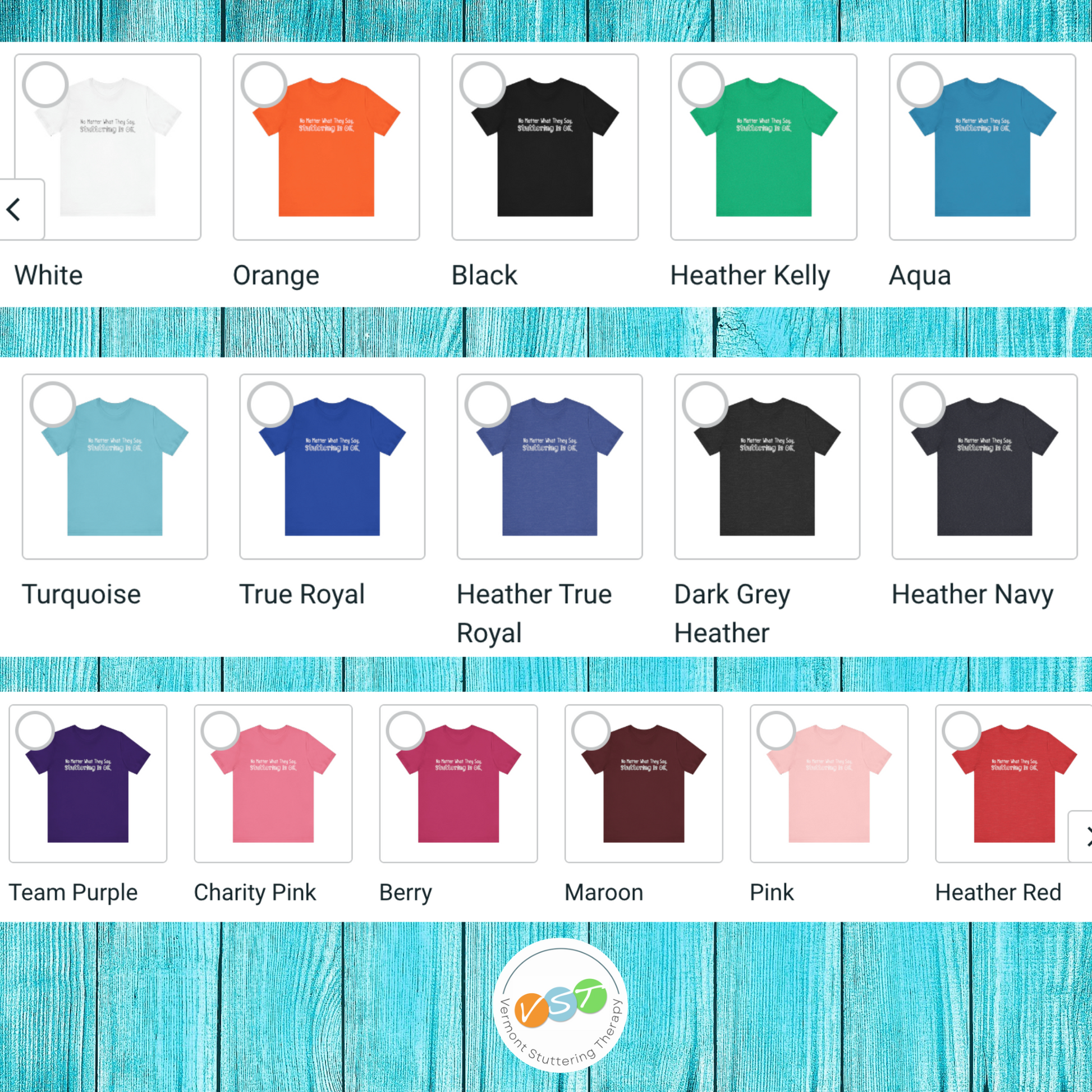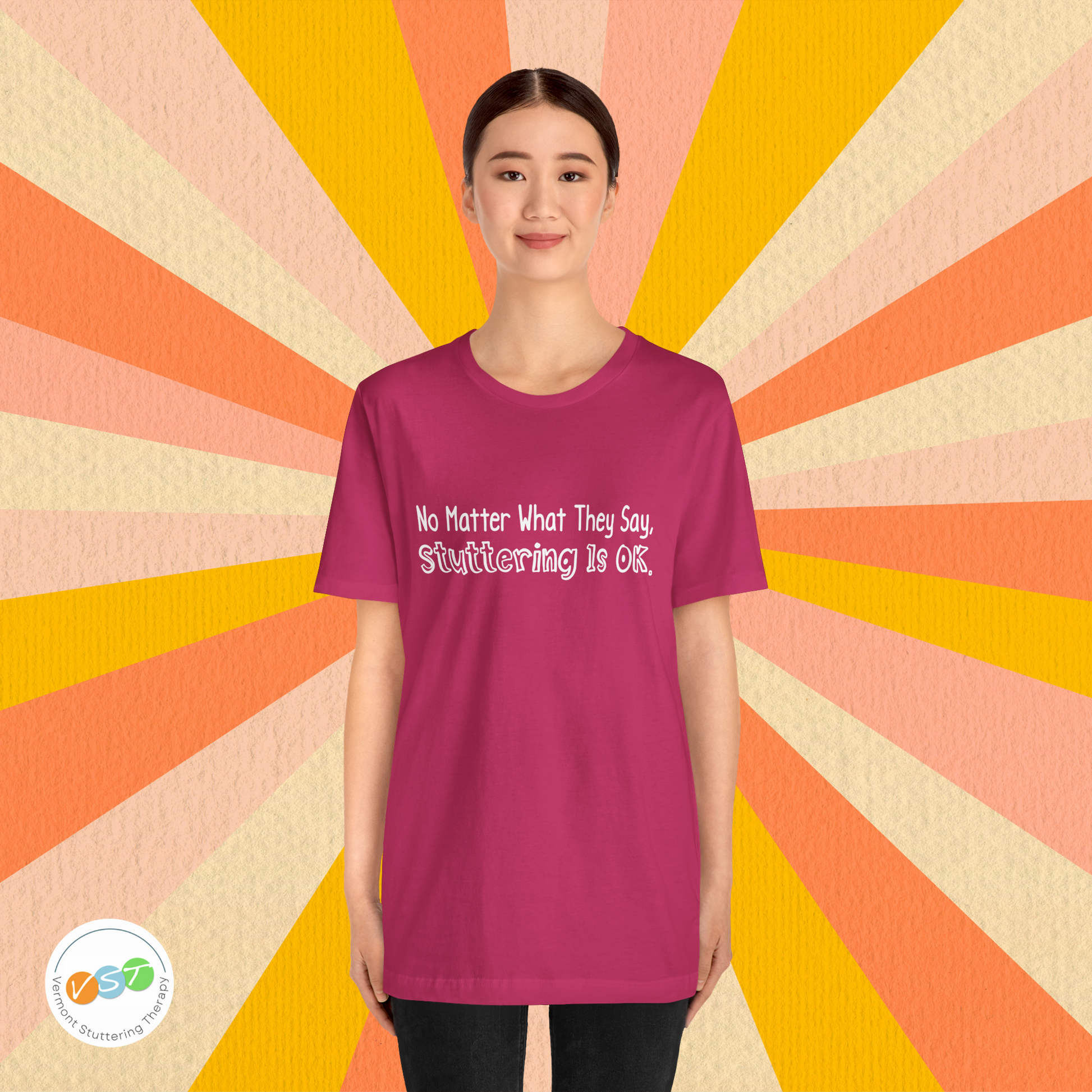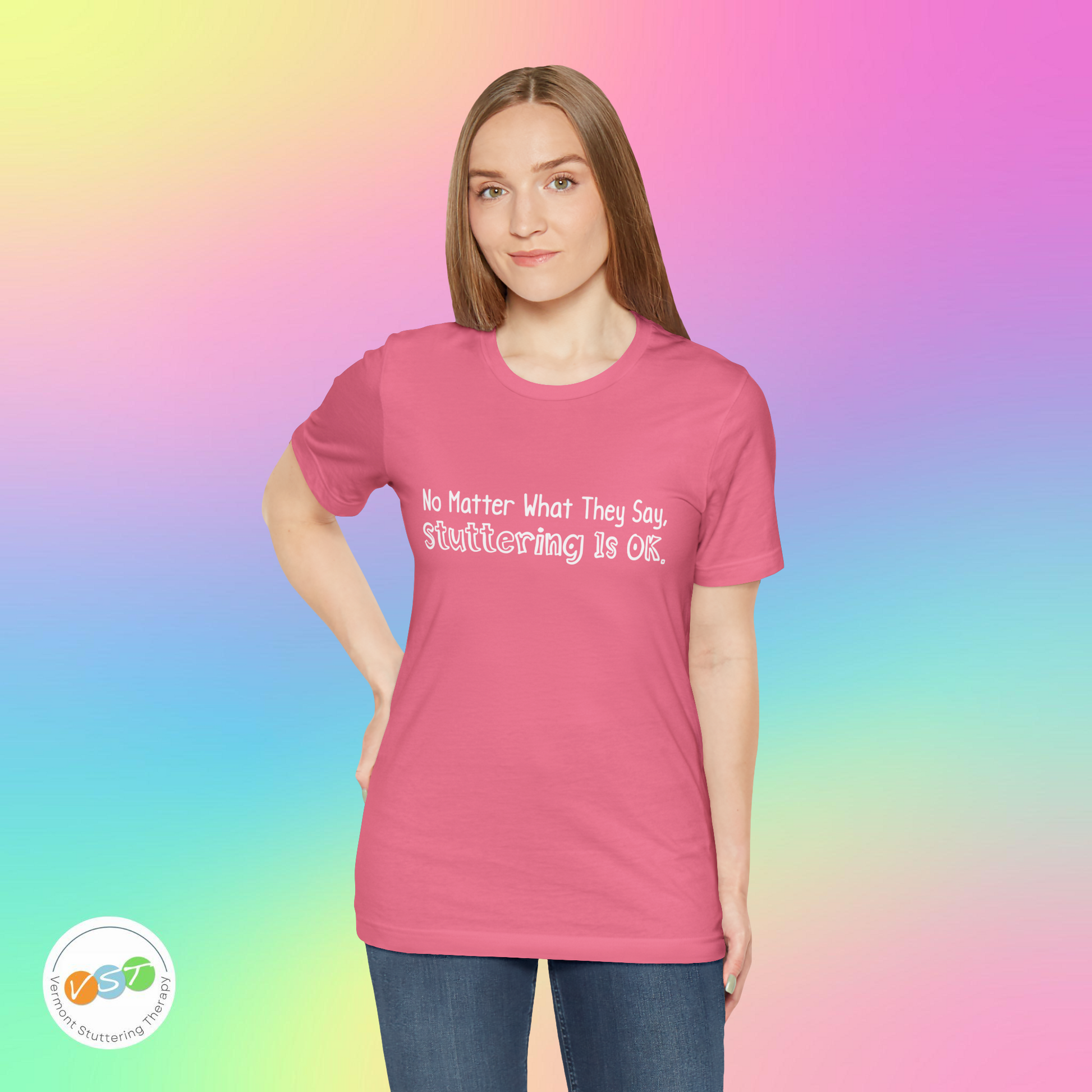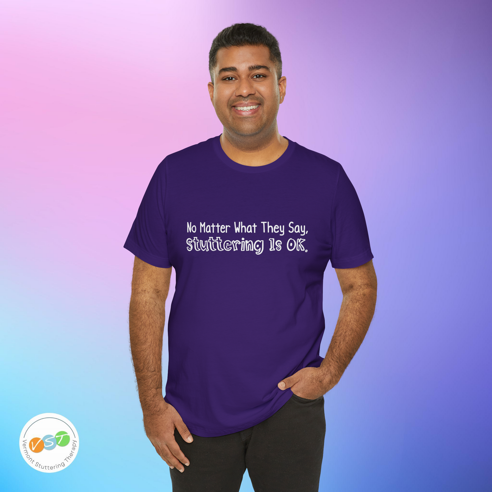 ✨This unisex "No Matter What They Say, Stuttering is OK" stuttering support t-shirt is an ideal gift for a person who stutters or stuttering ally as part of the Normalize Stuttering movement.